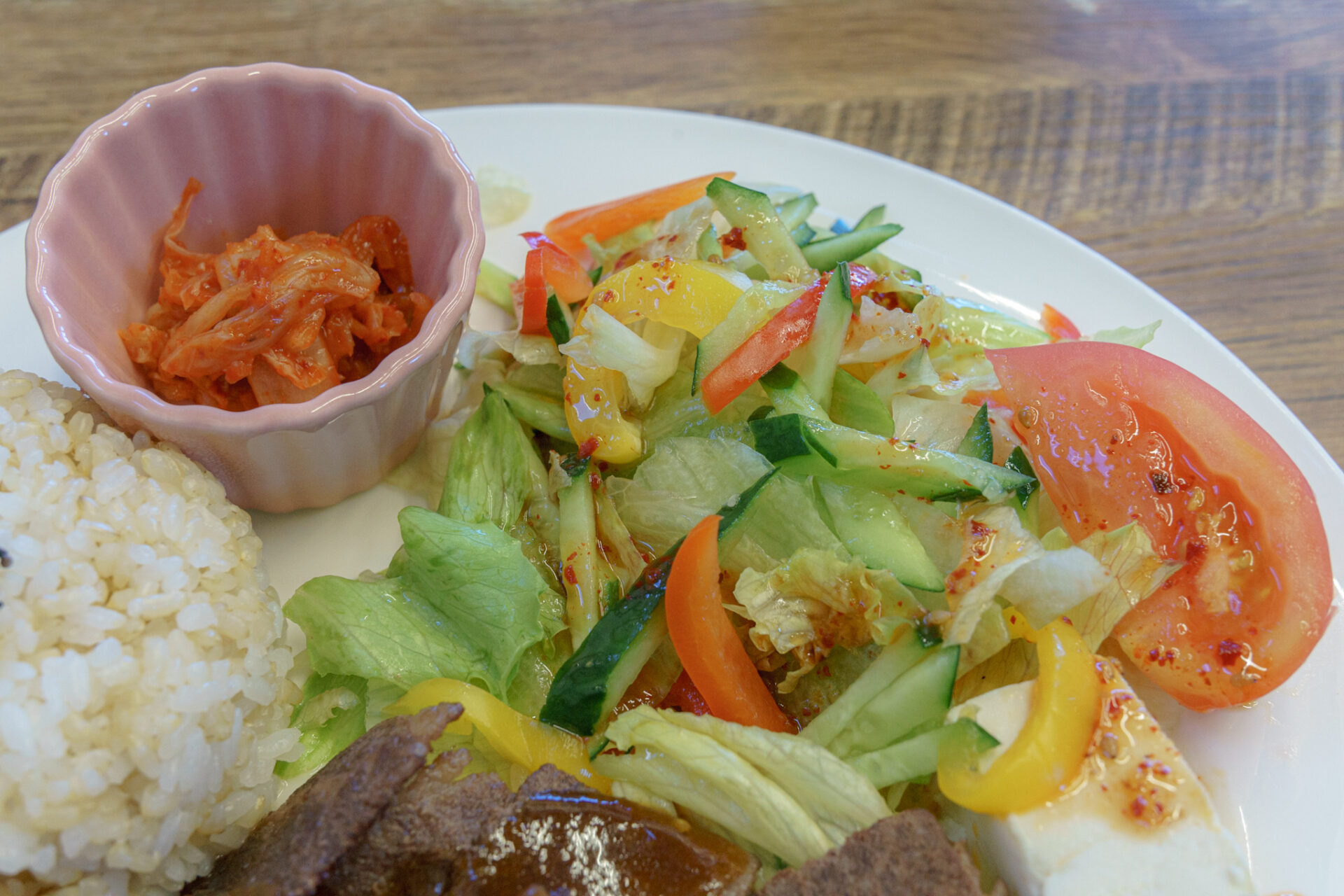 サラダは韓国のチョレギサラダ風で、ドレッシングがピリ辛です。