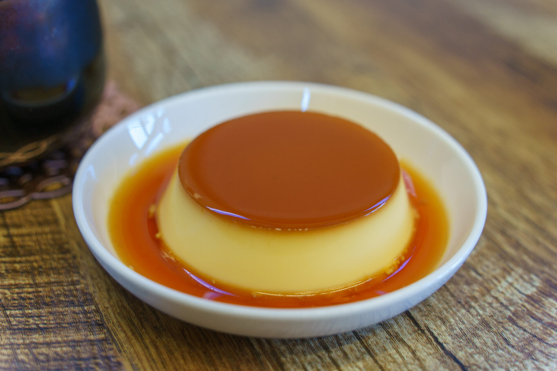 卵のコクをしっかり感じるなめらかなプリンで、カラメルは少し大人なほろ苦。