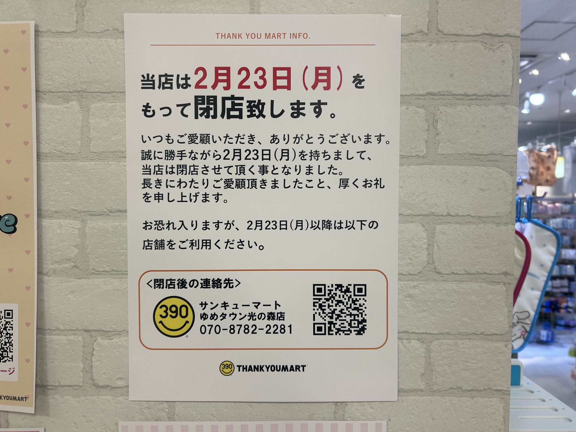『サンキューマート トキハわさだ店』の店頭に閉店のお知らせが掲示されていました。