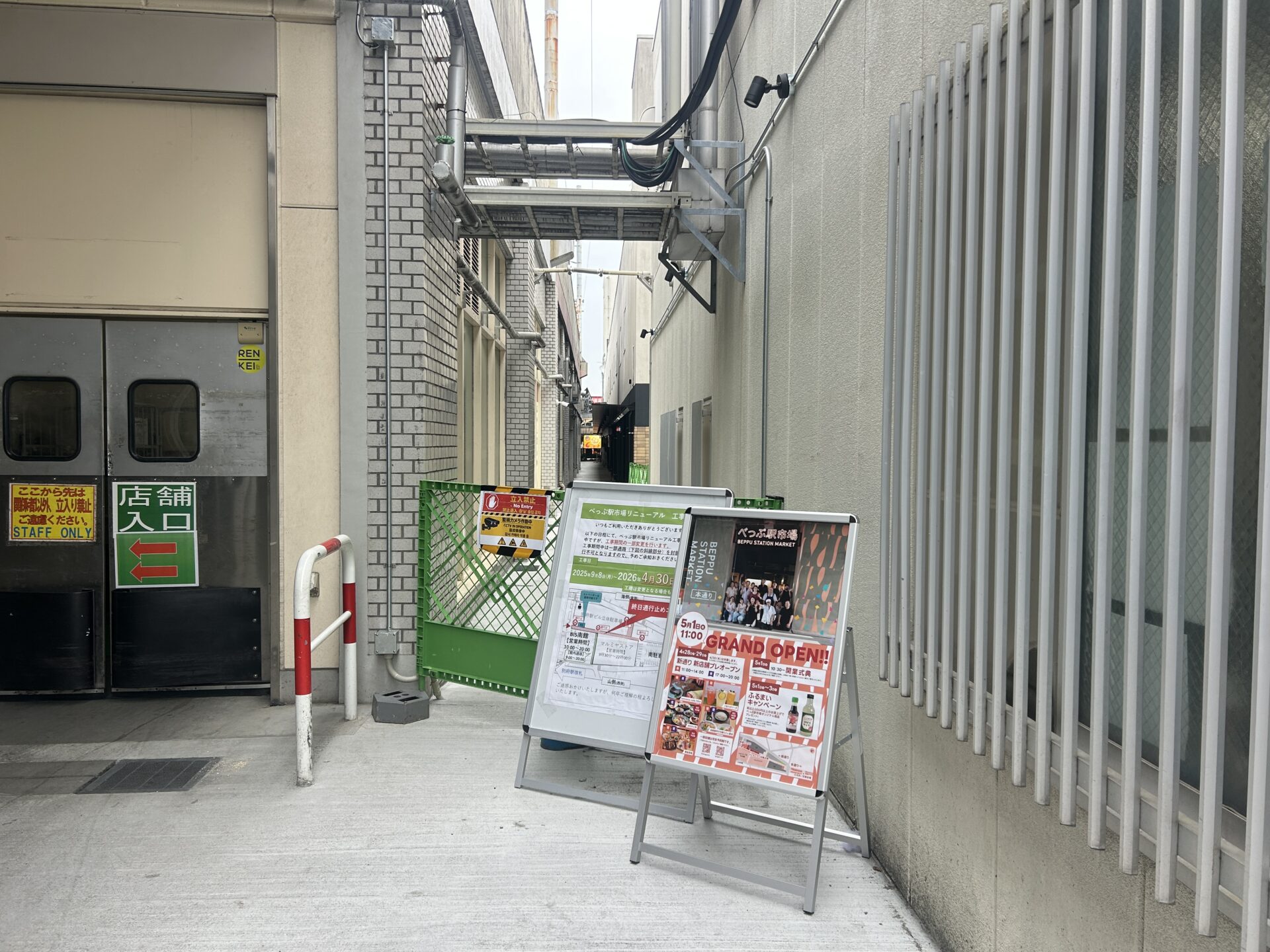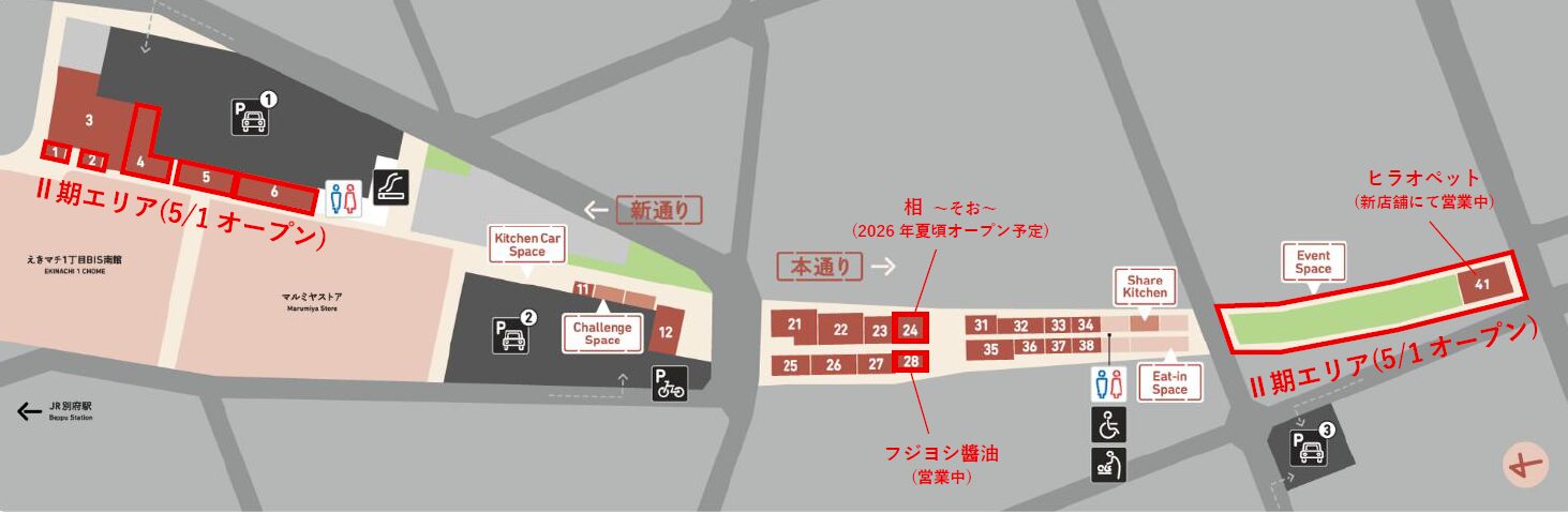 この先にチャレンジスペースやLOG OITAでもご紹介した『GRAM & GLAN』や『10 COFFEE BREWERS 別府駅高架下店』がある新通り、『フジヨシ醤油 べっぷ駅市場店』などがある本通り、そして新たにオープンする高架下イベントスペースと続いていきます。