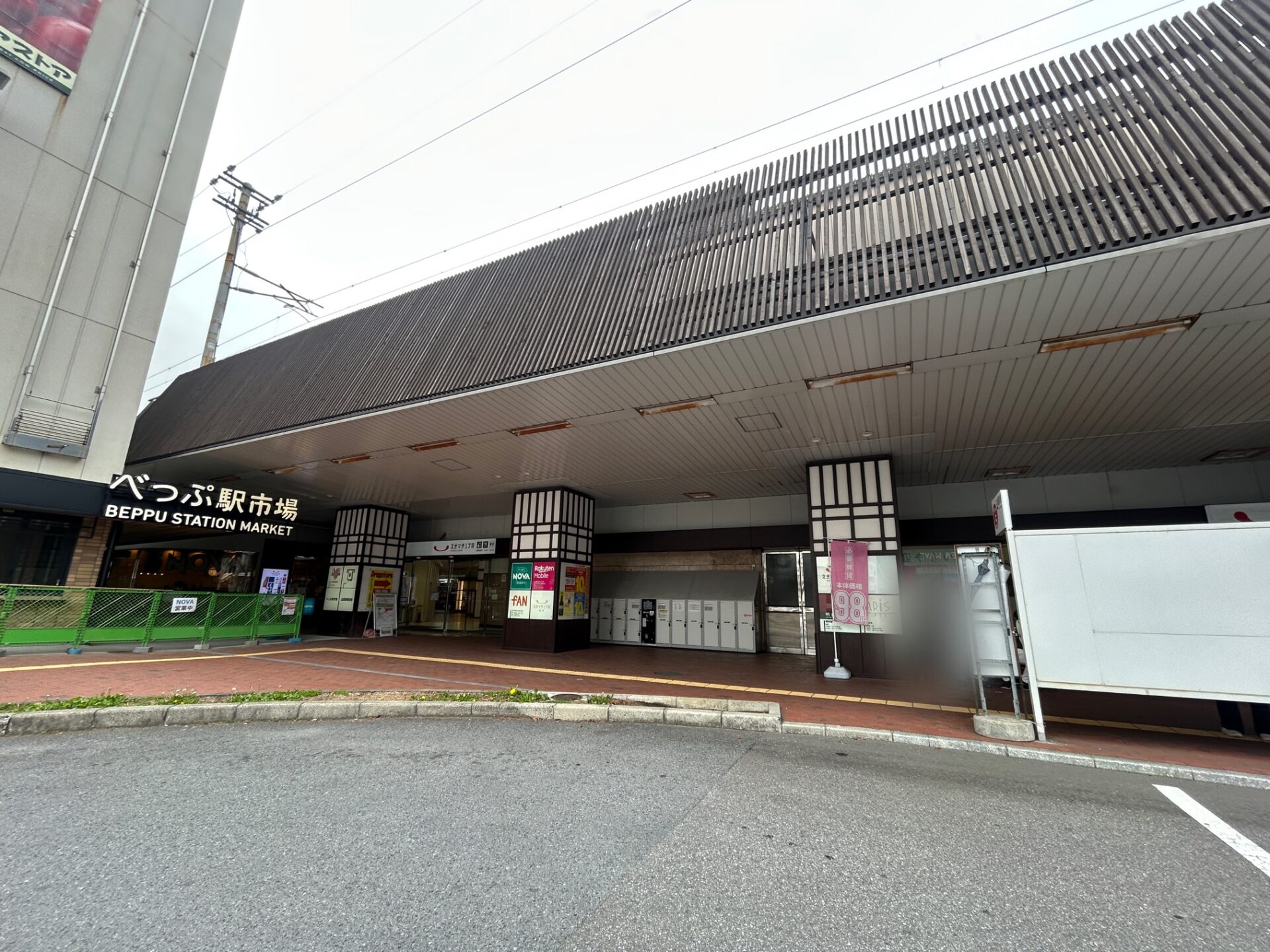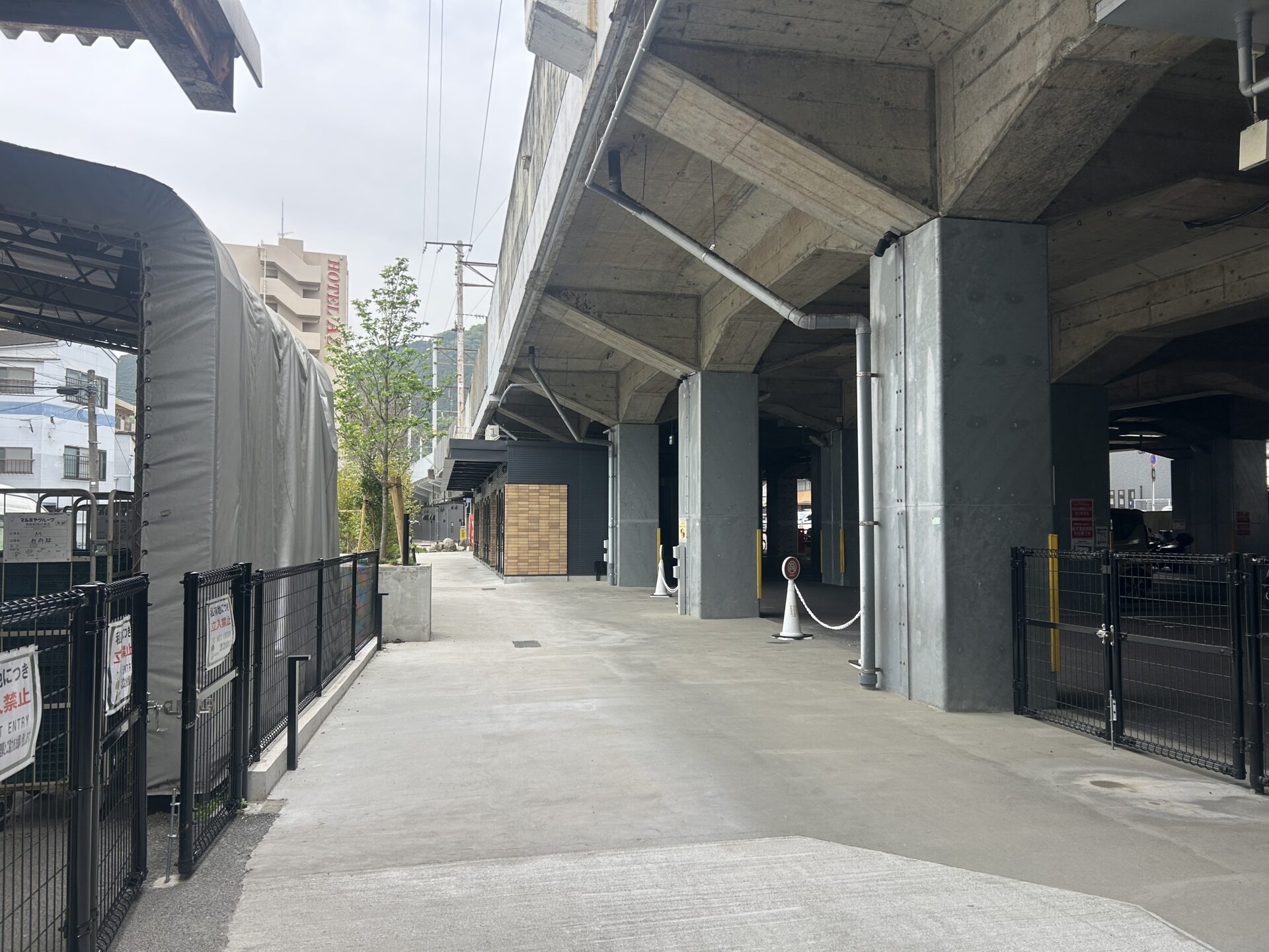 別府駅ビル駐車場と線路の間の通路に沿って店舗が建設されています。