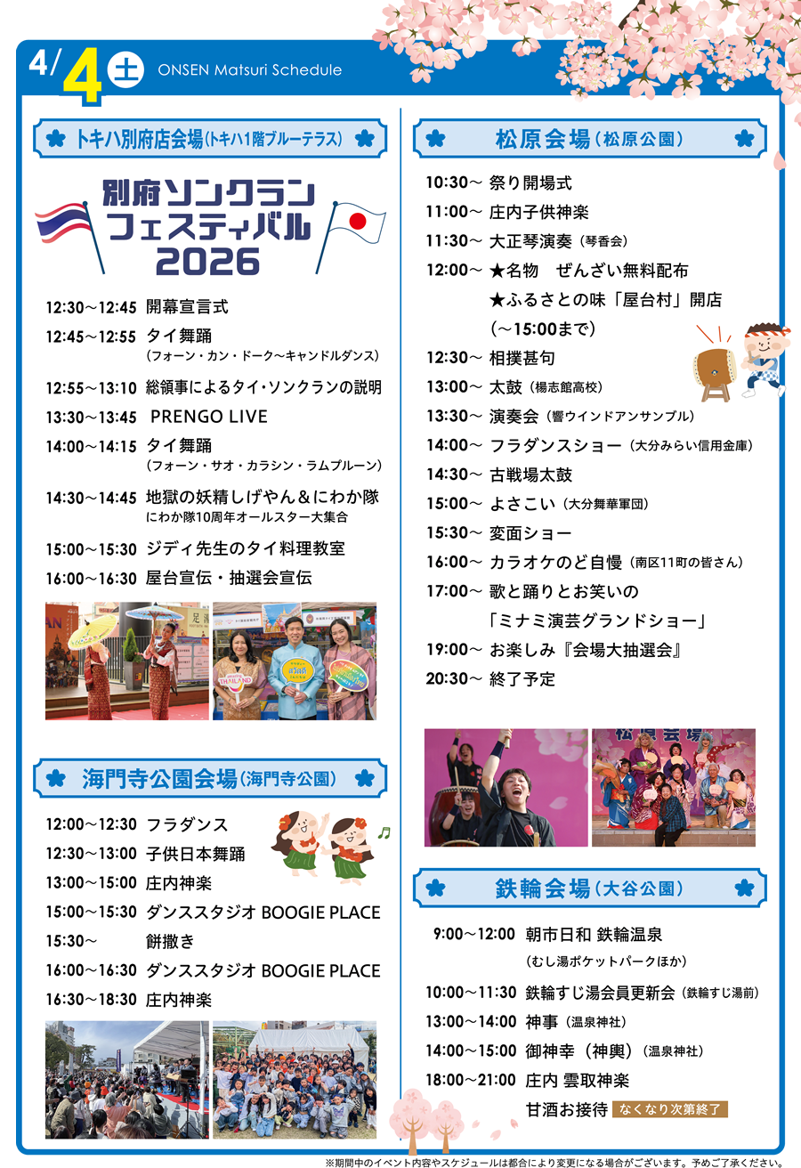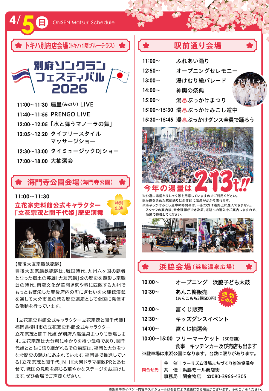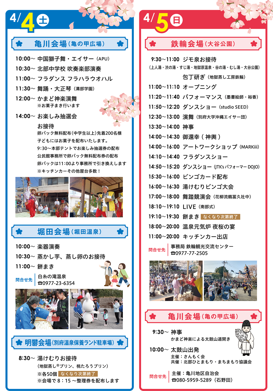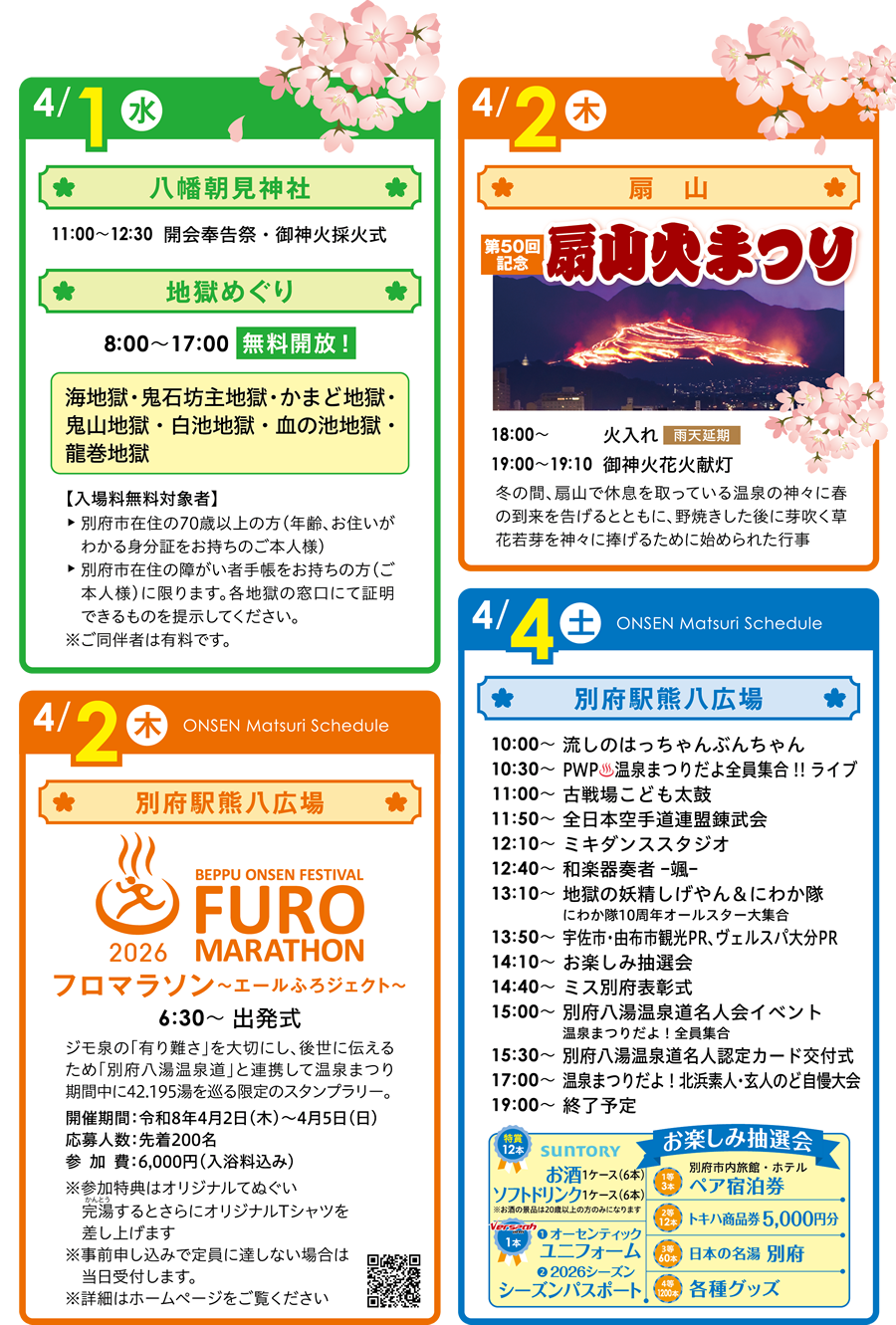 「別府八湯温泉まつり」は、温泉のめぐみに感謝するお祭りです。別府市では毎年4月1日を「温泉感謝の日」とし、その前後の期間に様々なイベントが開催されます。