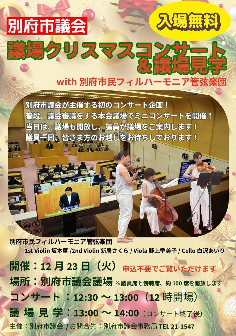 議会への関心を高める取り組みの一環として、議場コンサートを開催。コンサート後は、別府市議会議員による議場見学も予定されています。
