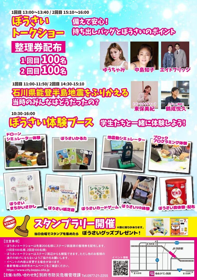 ゆうちゃみ、エイトブリッジ、中島知子、大分大学鶴成教授を始め、著名人による防災のトークショーコーナーや、石川県能登半島地…