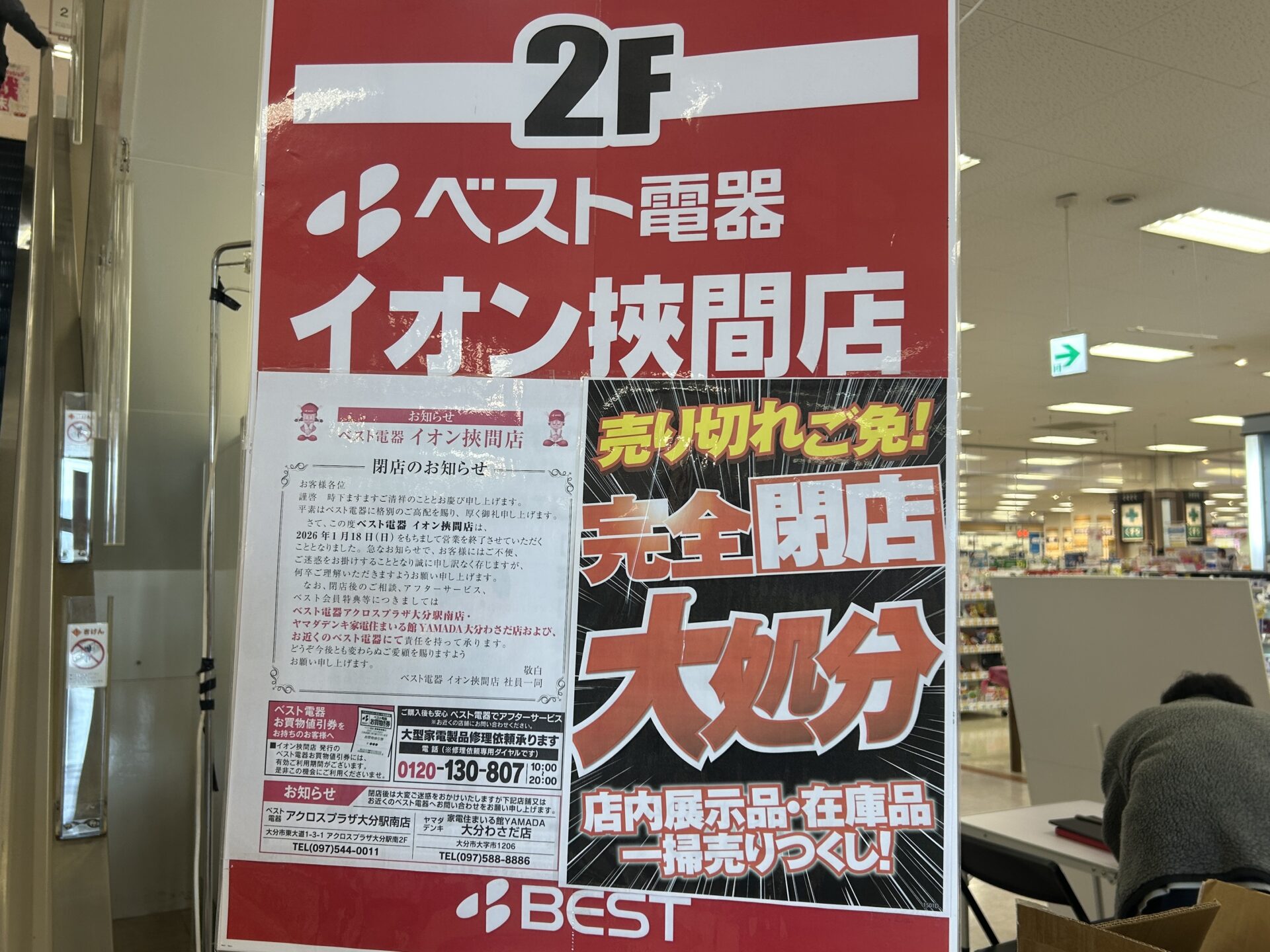 イオン狭間店2階の『ベスト電器 イオン狭間店』が閉店するそうです。