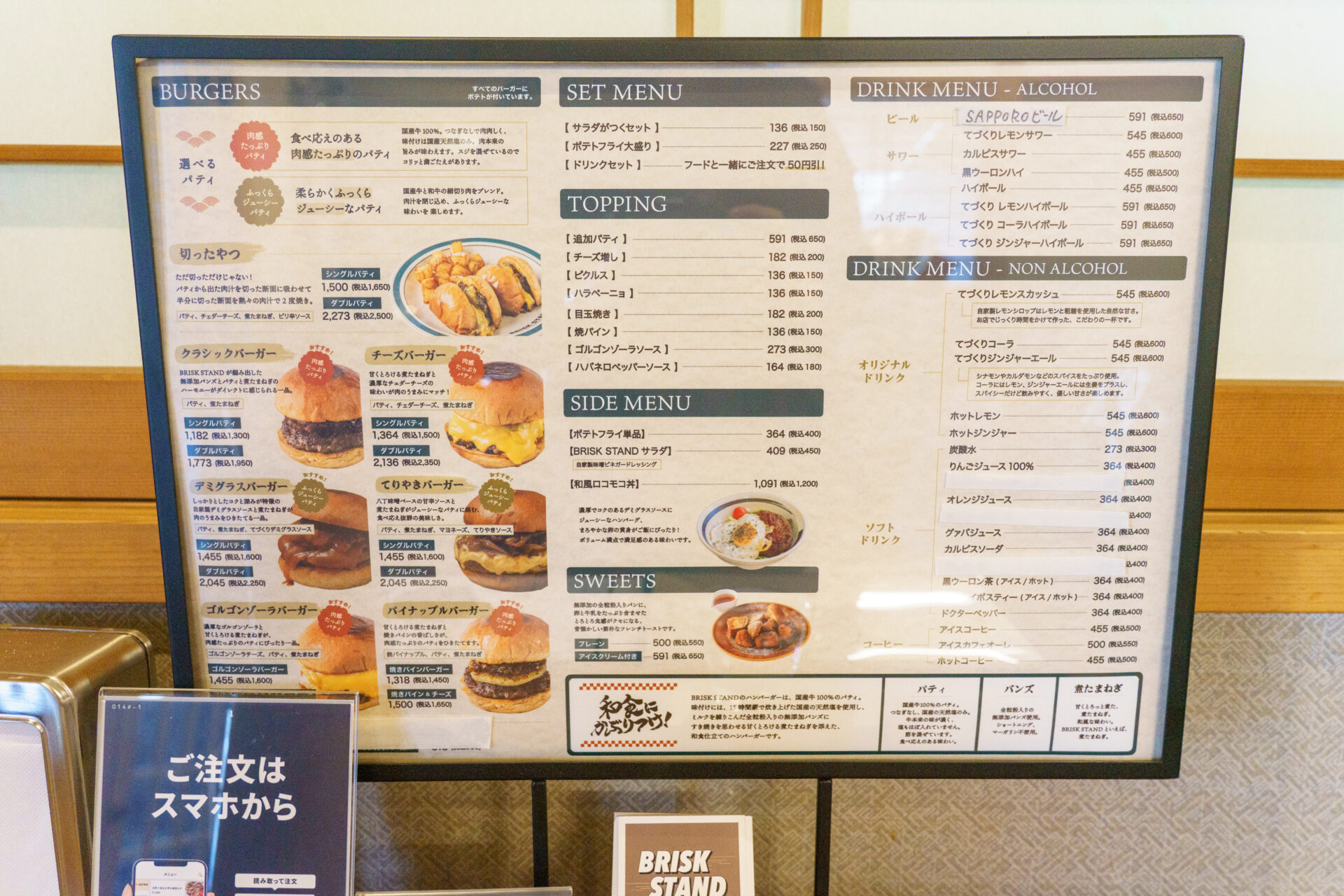 メニューは『BRISK STAND』の代表的なメニュー”切ったやつ”をはじめ、クラシックハンバーガーやチーズバーガー、パイナップルバーガー、てりやきバーガーなど各種ハンバーガーのほか、お子様ハンバーグプレートや和風ロコモコ丼などのサイドメニューも充実しています。