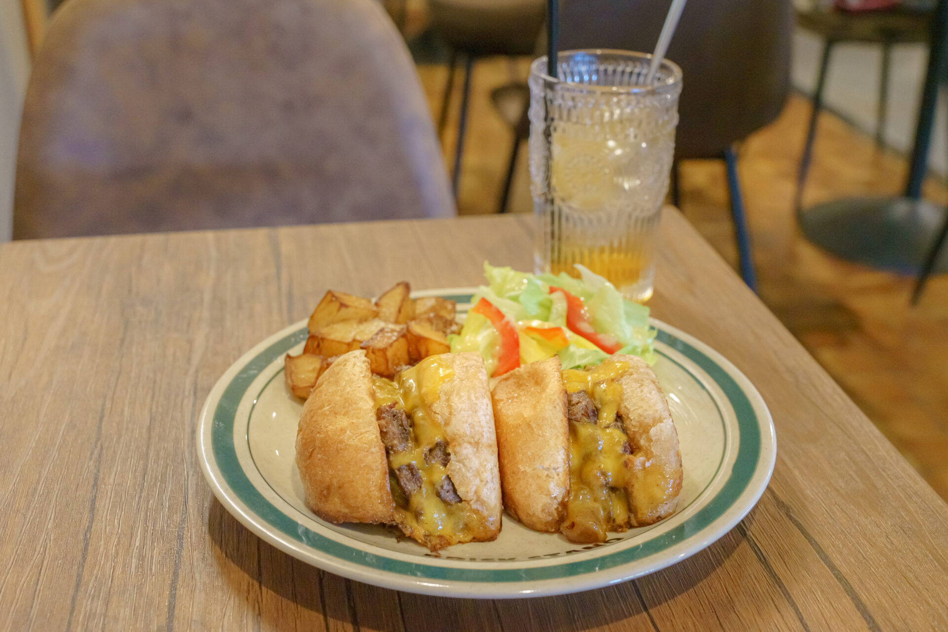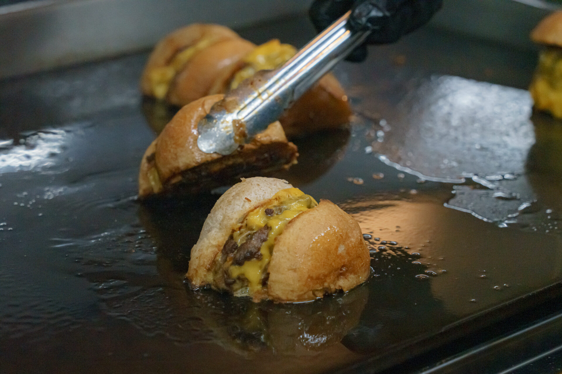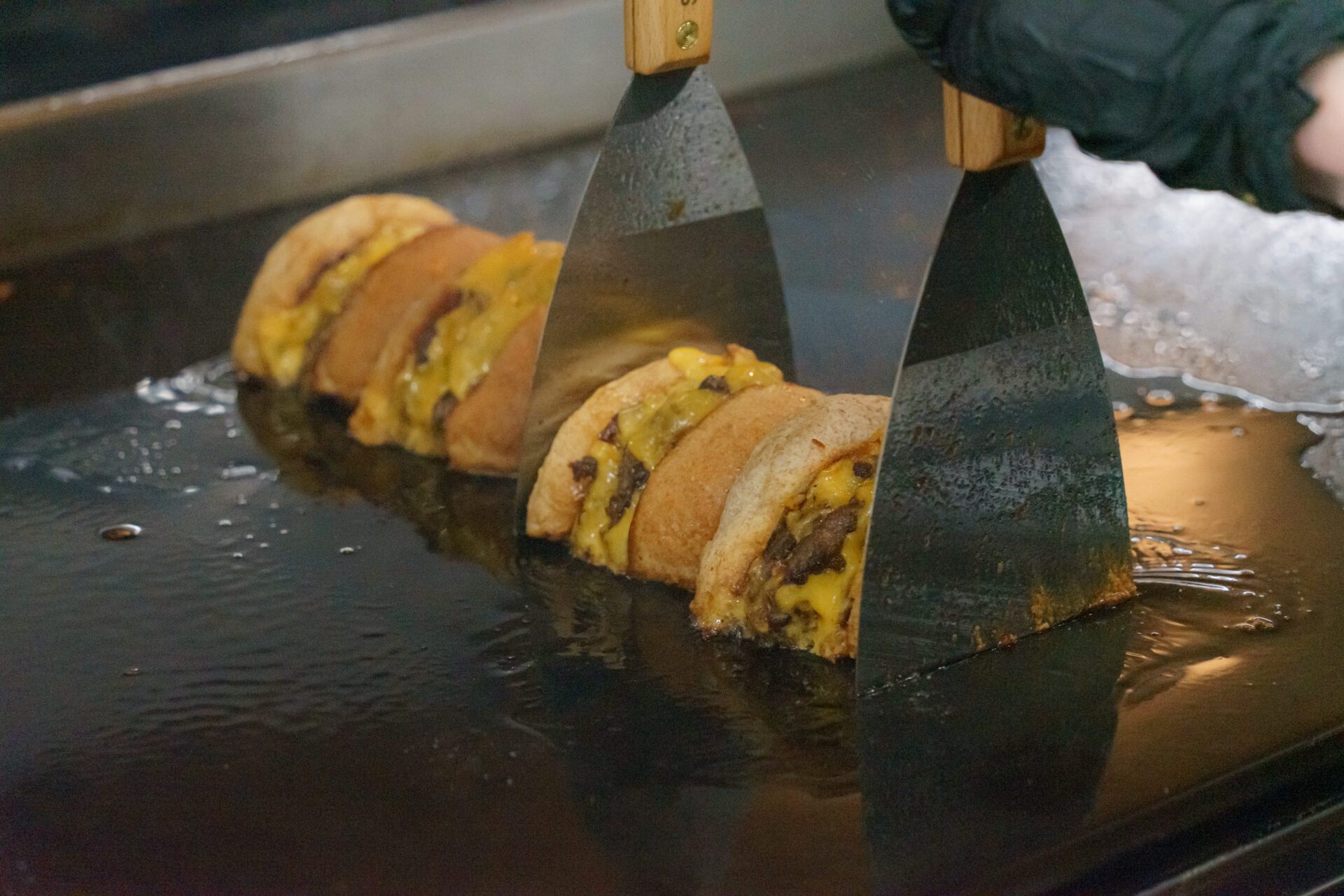 “切ったやつ“はその名の通り、ハンバーガーを二等分しているのですが、パティから出た肉汁を切った断面に吸わせて、半分に切った断面を熱々の肉汁で 2度続きしています。