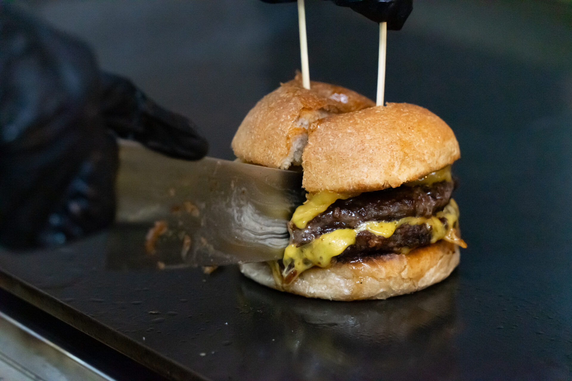 ハンバーガーとして一度形を作ったものを真っ二つにカット!