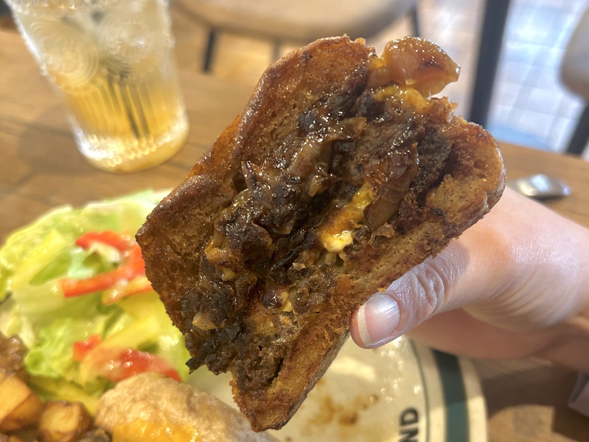 ハンバーガーの間にはとろとろの煮玉ねぎがたっぷり挟まれているのですが、甘みとコクが引き立っていてその美味しさに驚きました。
