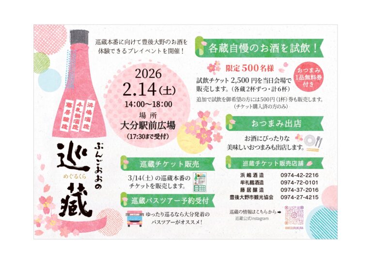 大分駅前で「豊後大野のお酒を体験」できる!巡蔵プレイベント『PRE巡蔵』が開催されます。