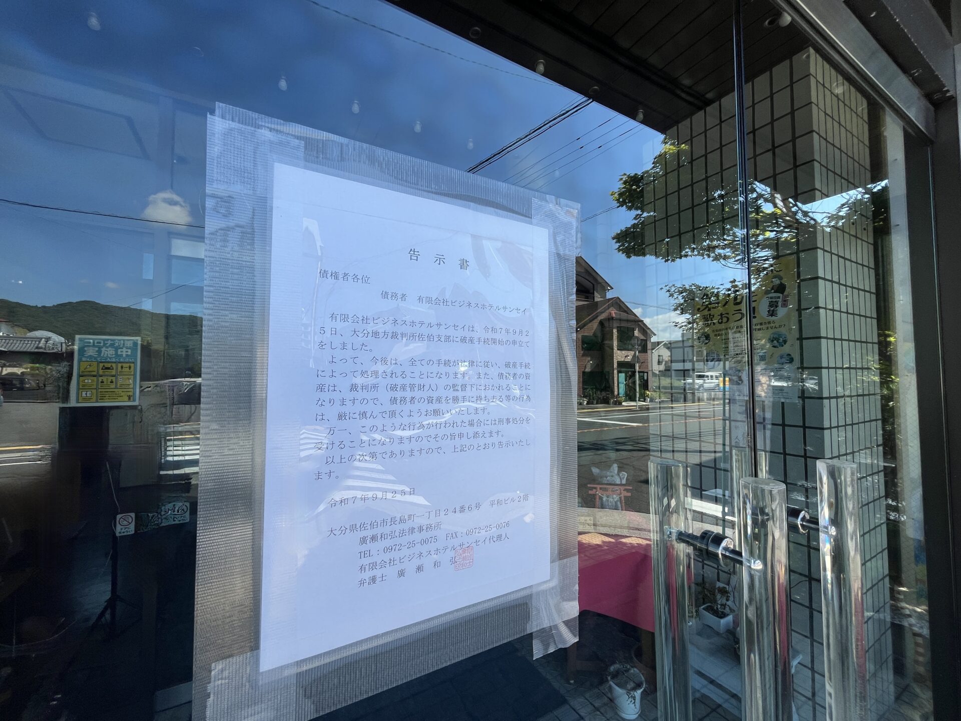 佐伯市の『ビジネスホテルサンセイ』が破産申請のため閉業していました。