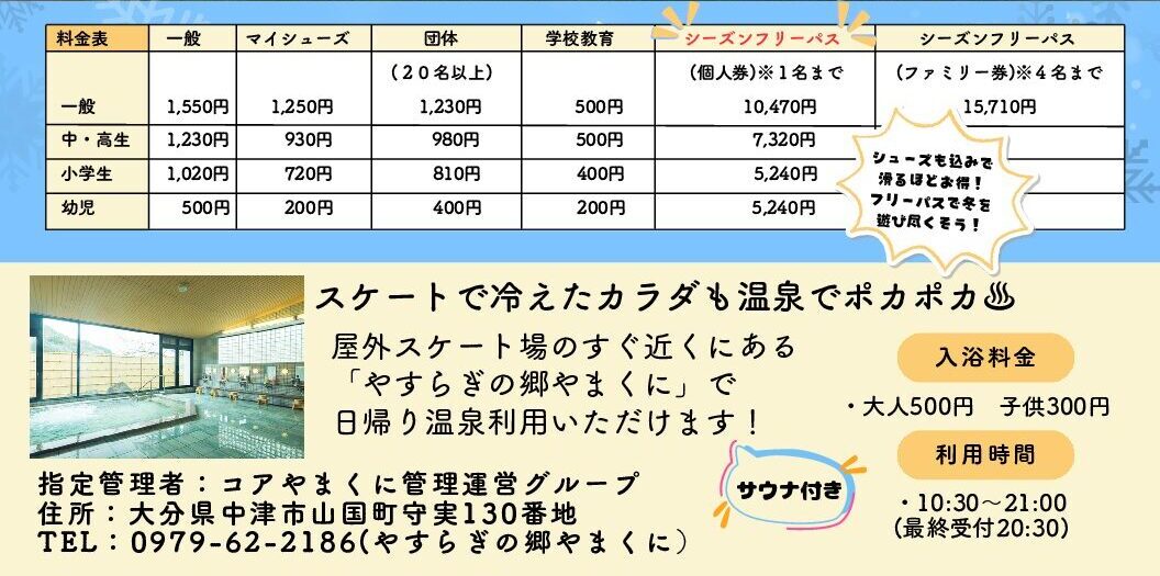 スケートの後は、すぐ近くにある「やすらぎの郷やまくに」の温泉もオススメです。サウナもあり 整えます。