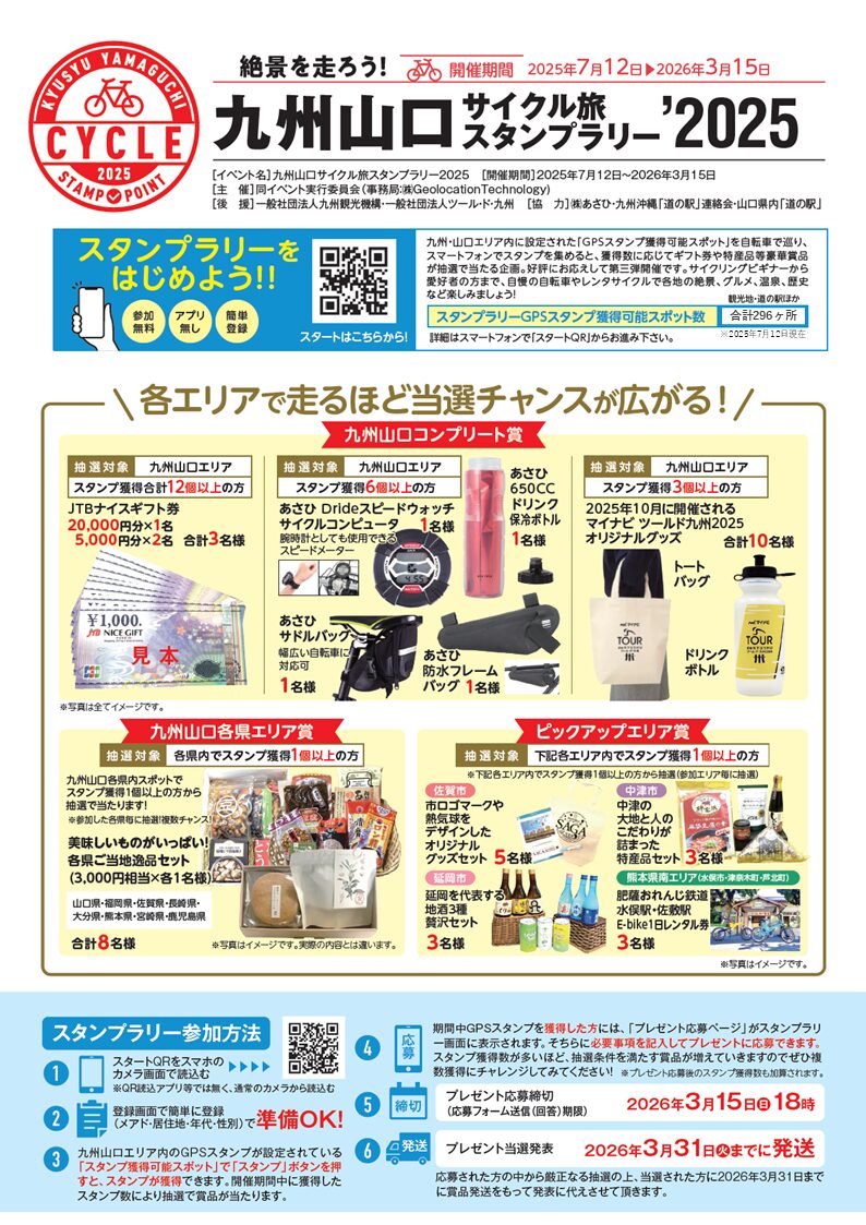 海に山にグルメや温泉を楽しみながら、絶景スポットや観光名所をめぐり、スマホでスタンプを集めるサイクリングイベント。対象スポットは九州・山口各地に296か所。参加無料で、獲得スタンプ数に応じて地域の特産品やオリジナルグッズなど豪華賞品が当たるチャンスがあります。