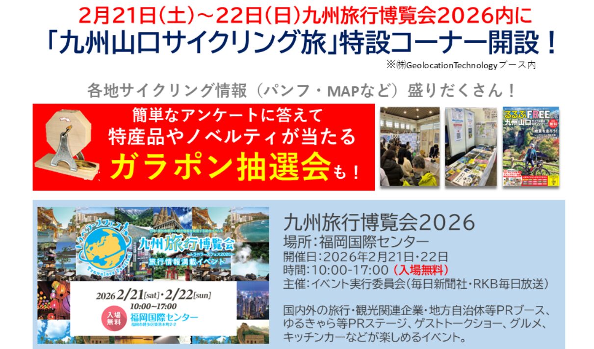 また、毎年好評の『九州旅行博覧会2026』に “九州山口サイクル旅スタンプラリー 特設コーナー”が設けられます。