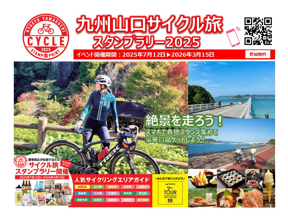 九州山口サイクル旅スタンプラリー2025開催!期間2025年7月12日~2026年3月15日。サイクリングで九州山口エリ…