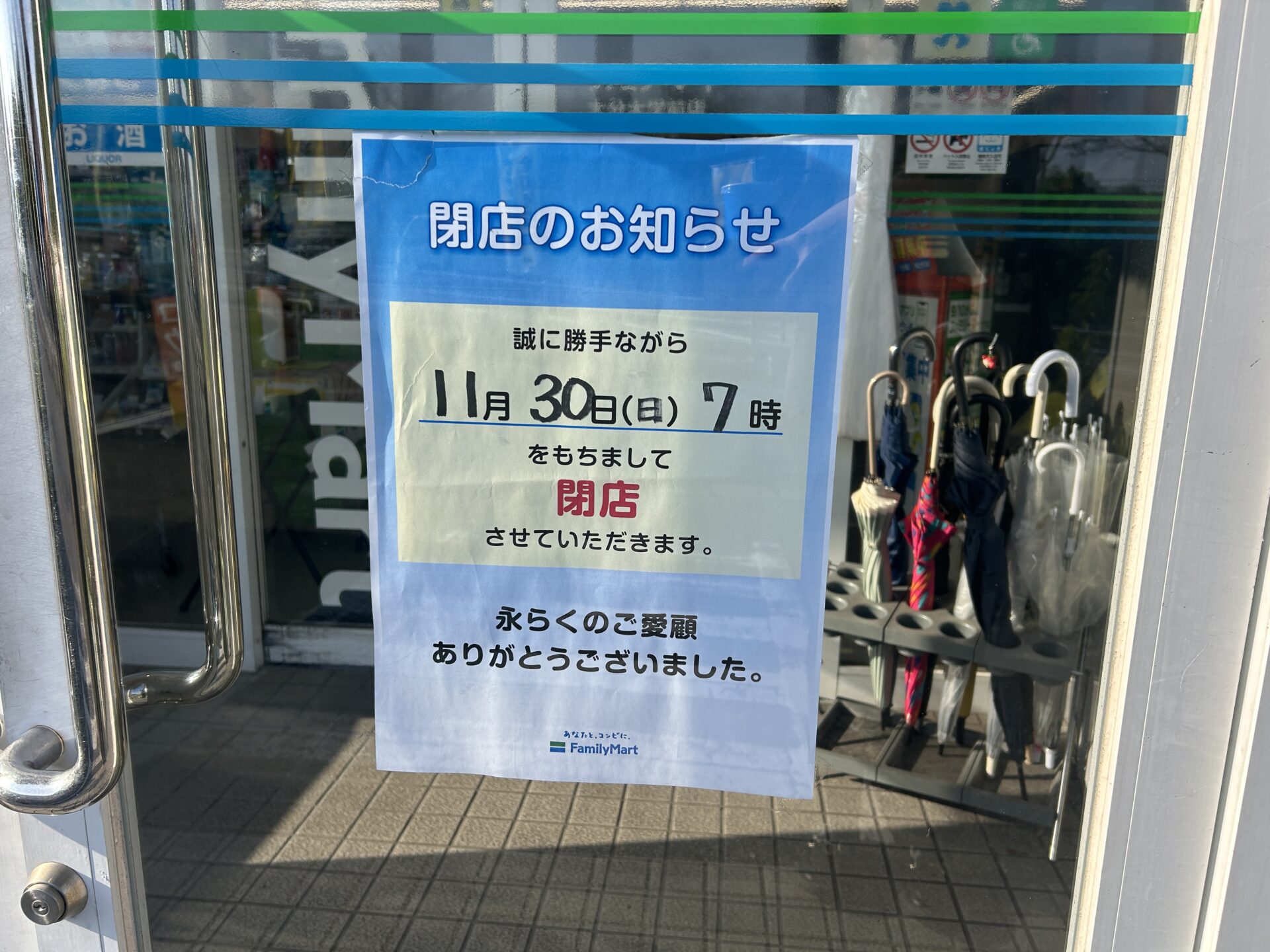 店頭に閉店のお知らせが掲示されており、それによると11月30日(日)7時に閉店するそうです。