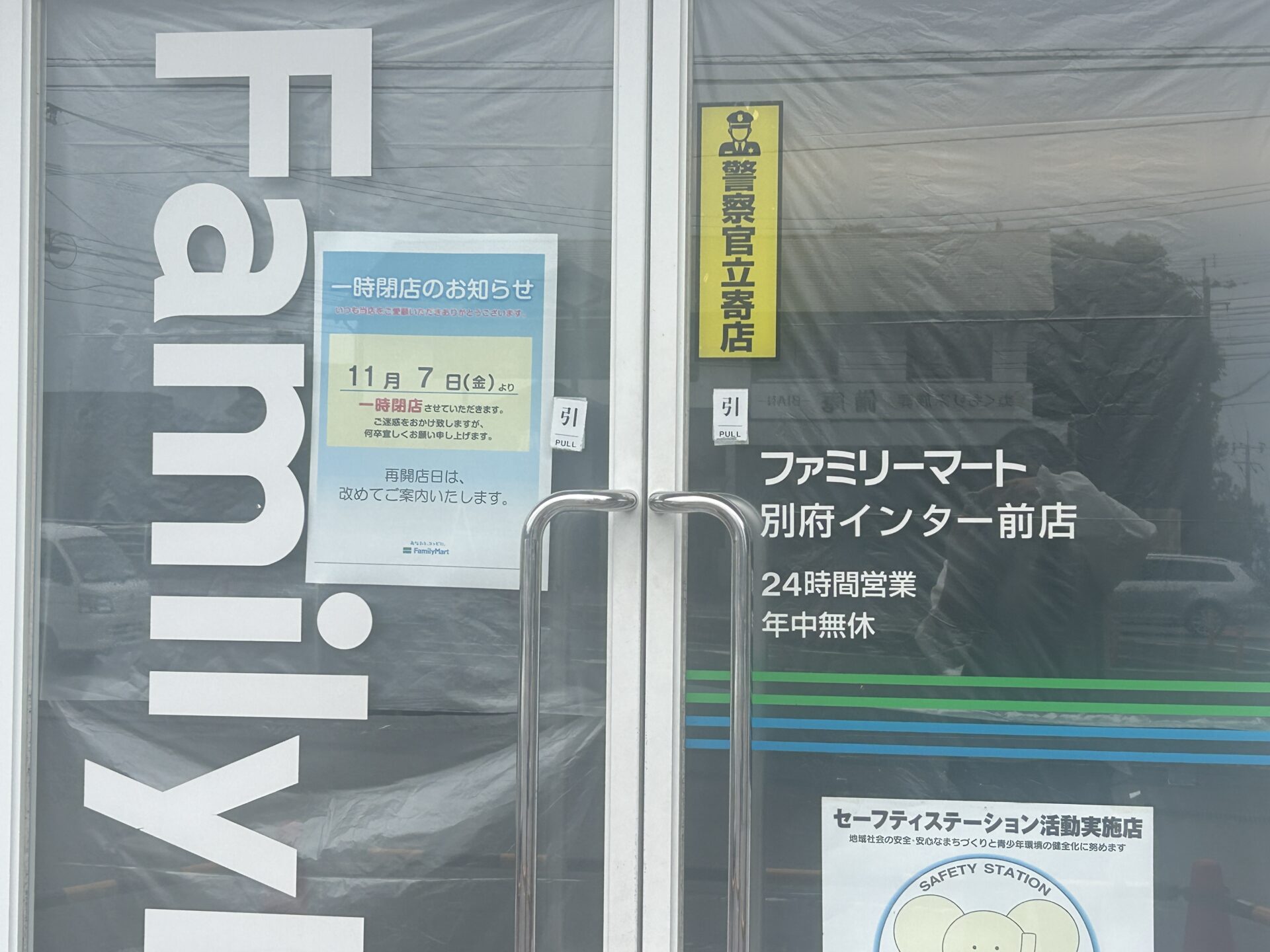 『ファミリーマート別府インター前店』が臨時休業のため閉店していました。