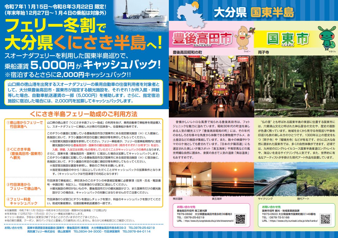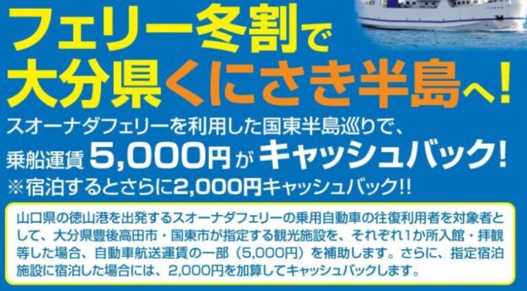 スオーナダフェリーを利用した国東半島巡りで、乗船運賃5,000円をキャッシュバック!