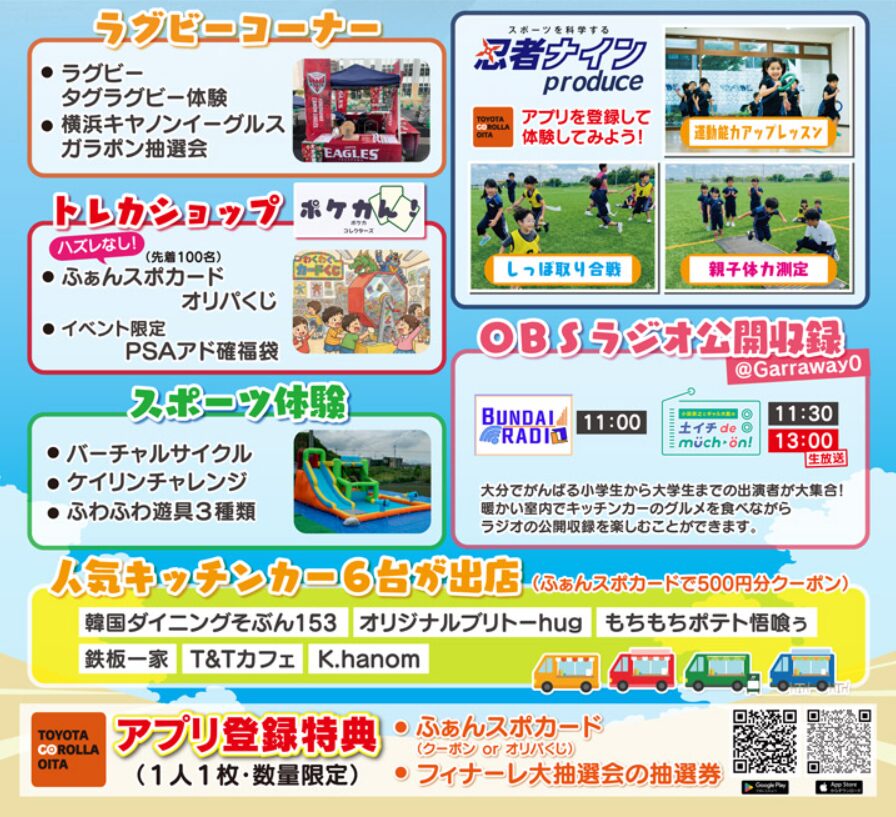 「人気お笑い芸人のミニライブ」「忍者ナインのスポーツ教室」「県内で人気のキッチンカー大集合」「トレカショップブース」「OBSラジオ公開収録」「フィナーレ大抽選会」など、楽しい催しが盛り沢山です♪