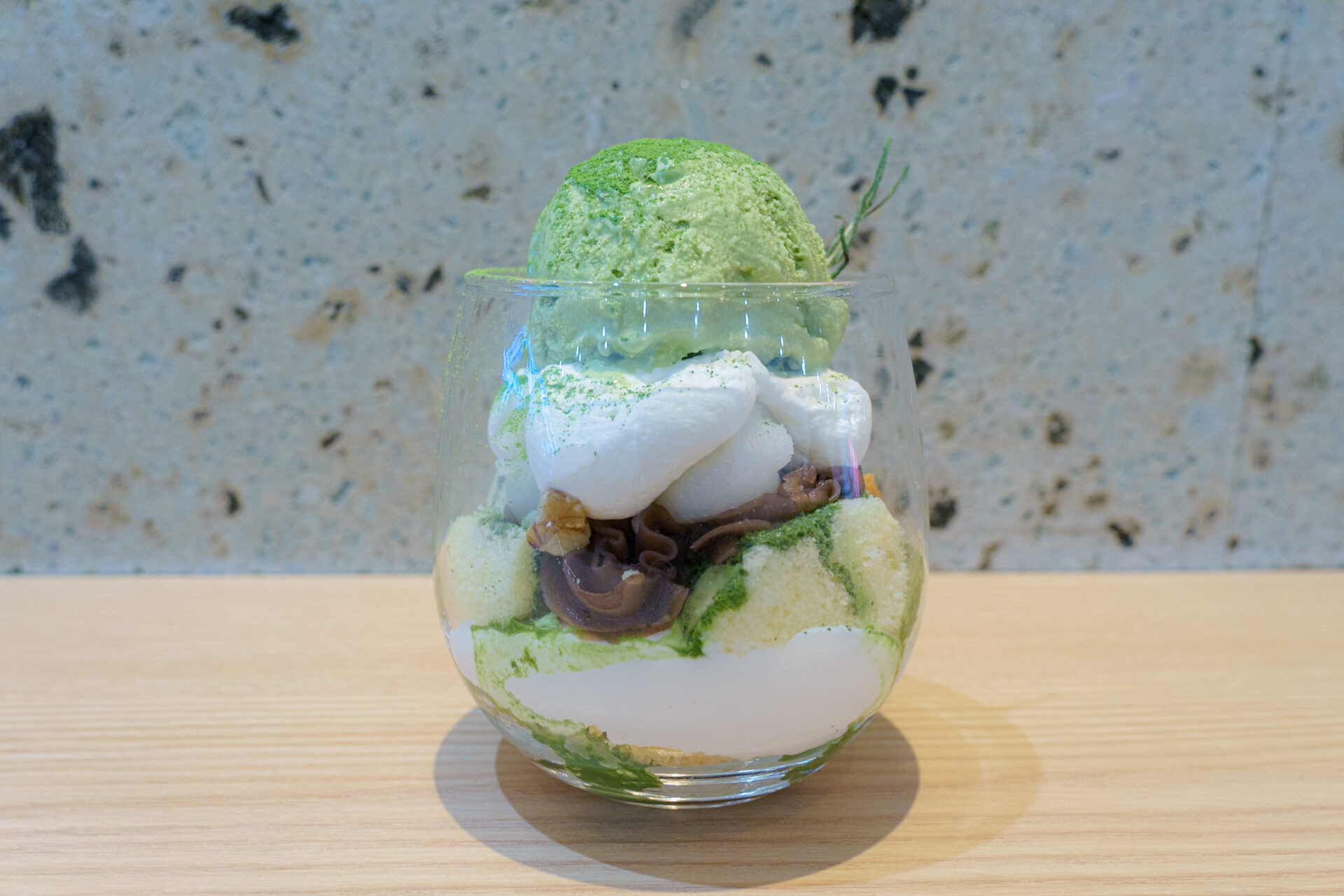 「抹茶パフェ」は、抹茶アイス・あんこ・ホイップクリーム・ナッツ・団子・スポンジ生地・シリアル・抹茶ソースが入ったとてもボリューミーなパフェ。
