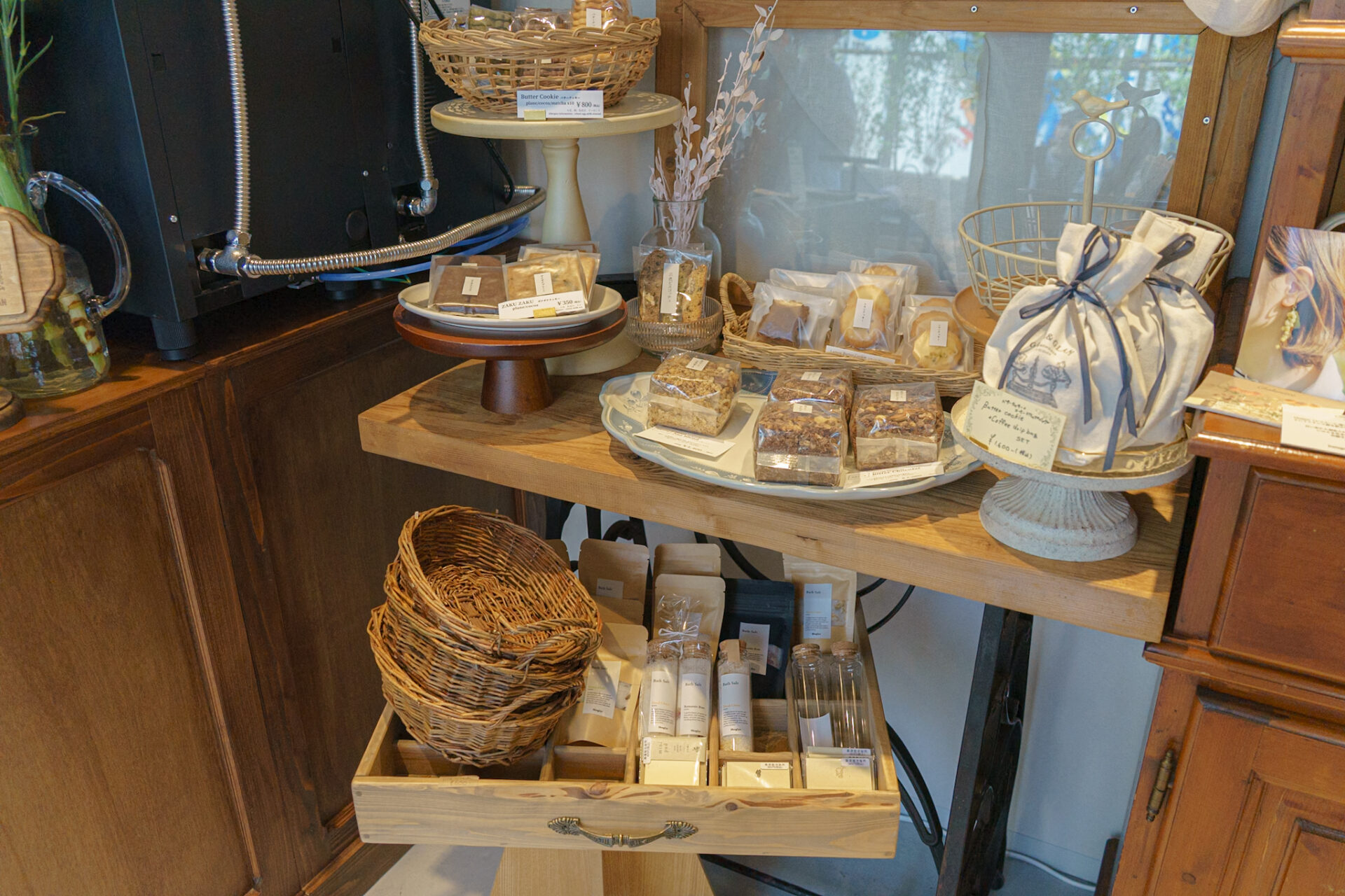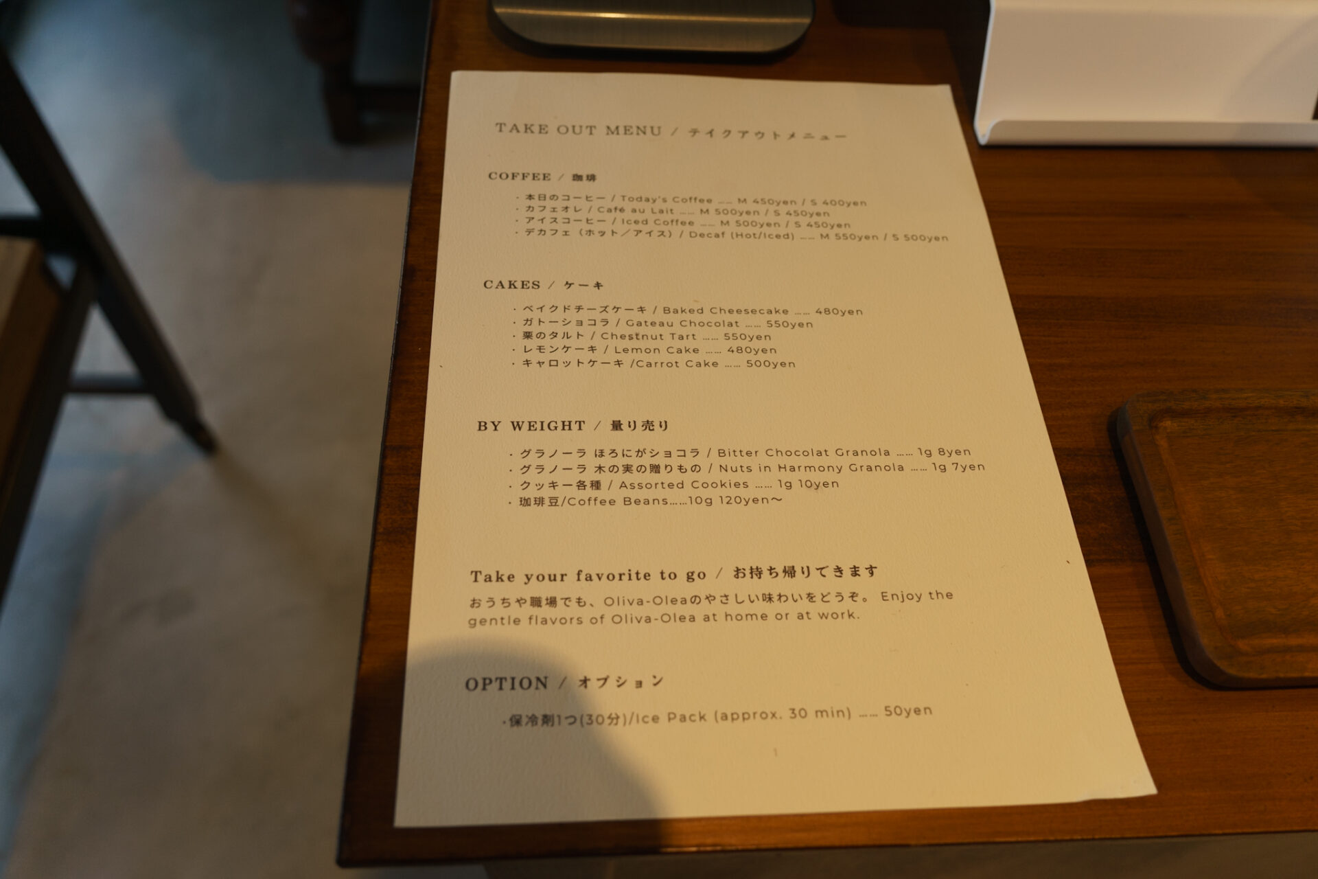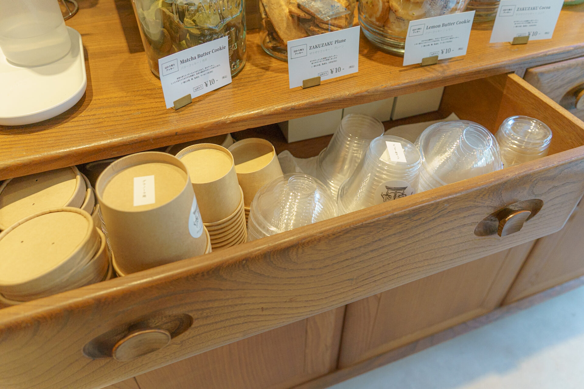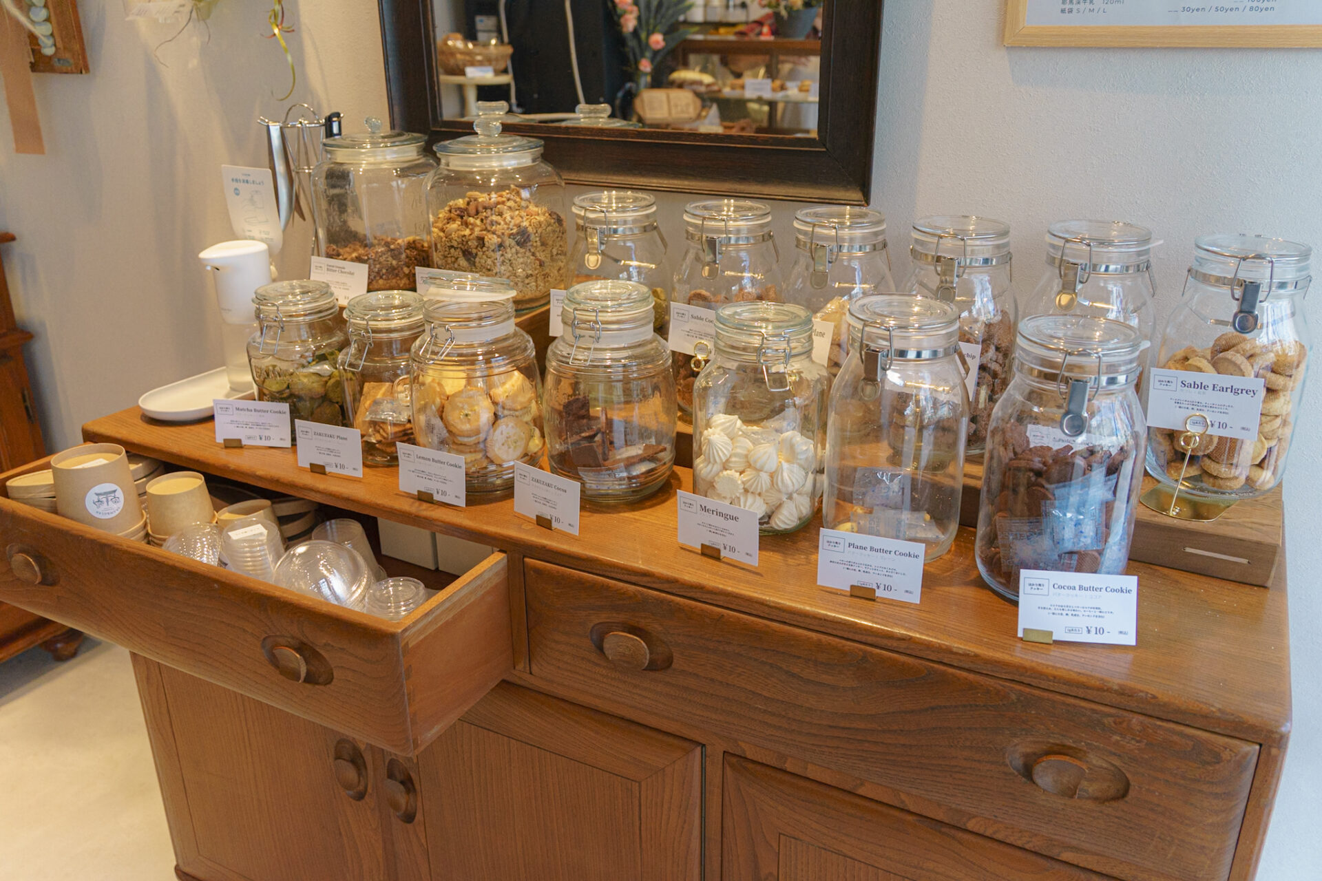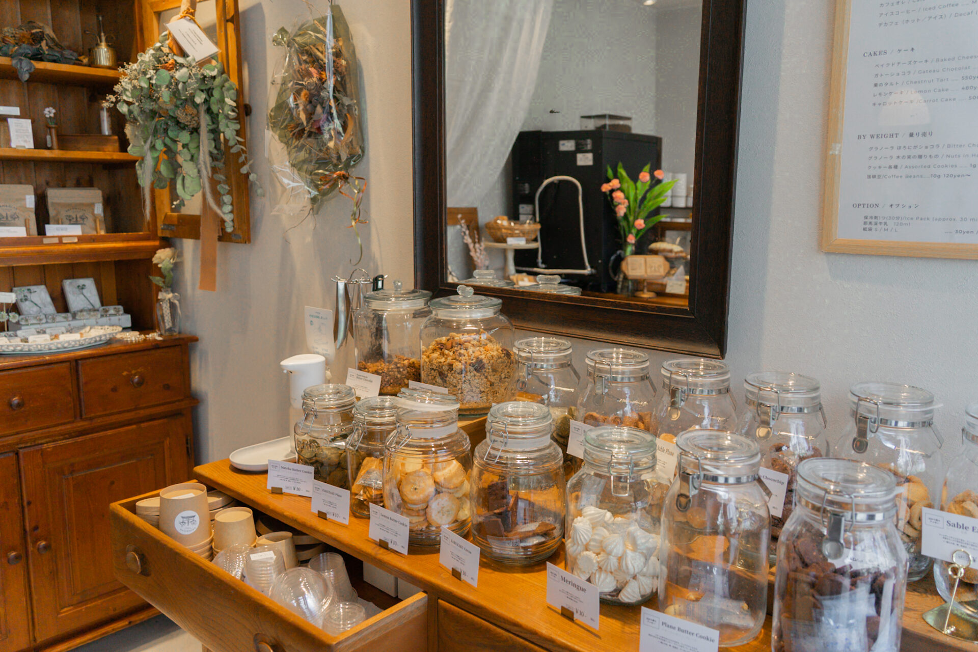 店内にあるクッキー以外にも、テイクアウトメニューもあり、コーヒー・カフェオレのテイクアウトやケーキの販売、そして量り売りで販売されているグラノーラに耶馬溪牛乳を注いでいただくことができます。