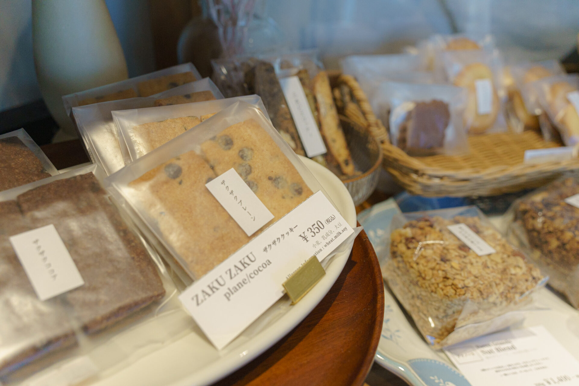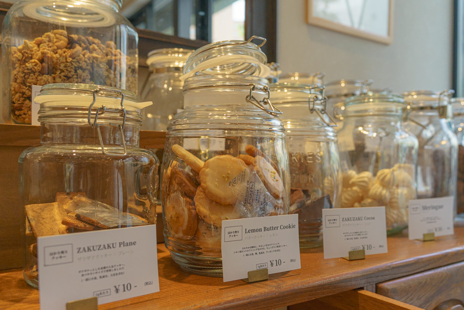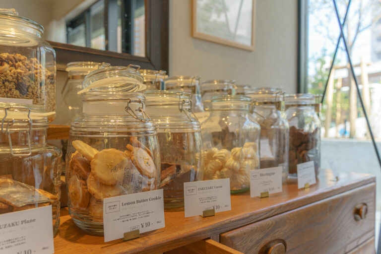 瓶に入った小さなクッキーやグラノーラなどがずらりと並んでいて、個包装での販売もあります。