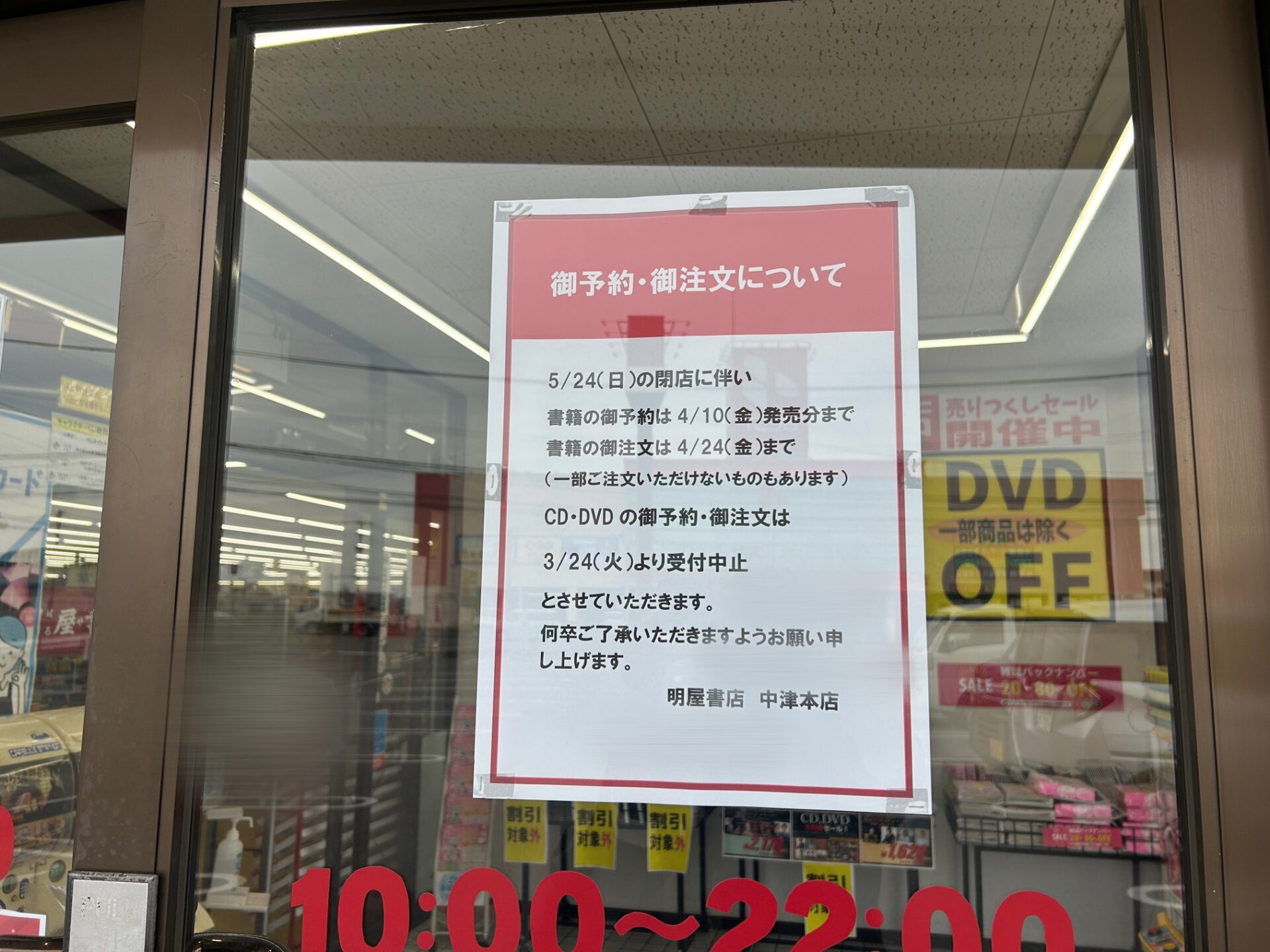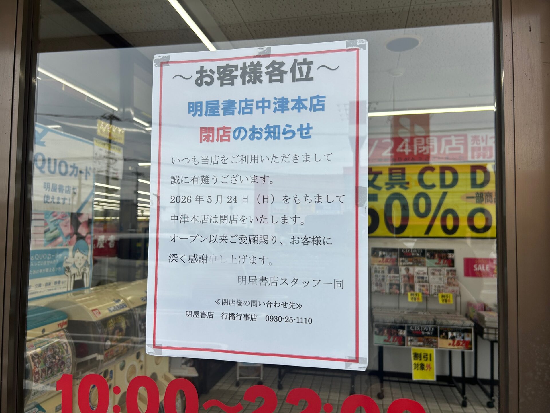 中津市の『明屋書店 中津本店』が閉店するそうです