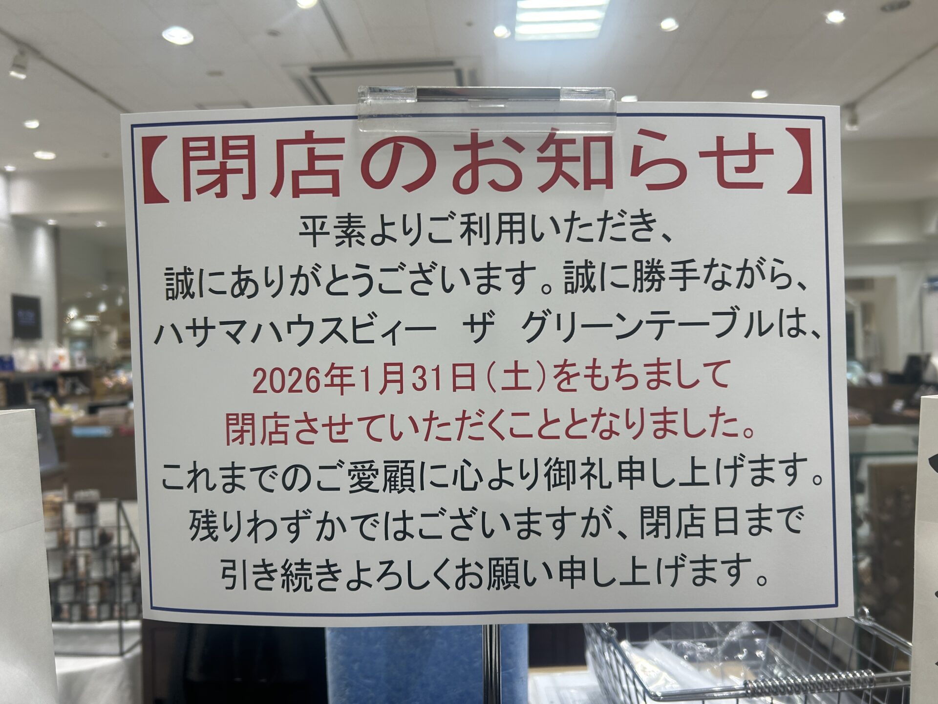 お知らせによると、【ハサマハウスビィー ザ グリーンテーブルは、2026年1月31日をもちまして閉店させていただくこととなりました】とのこと。