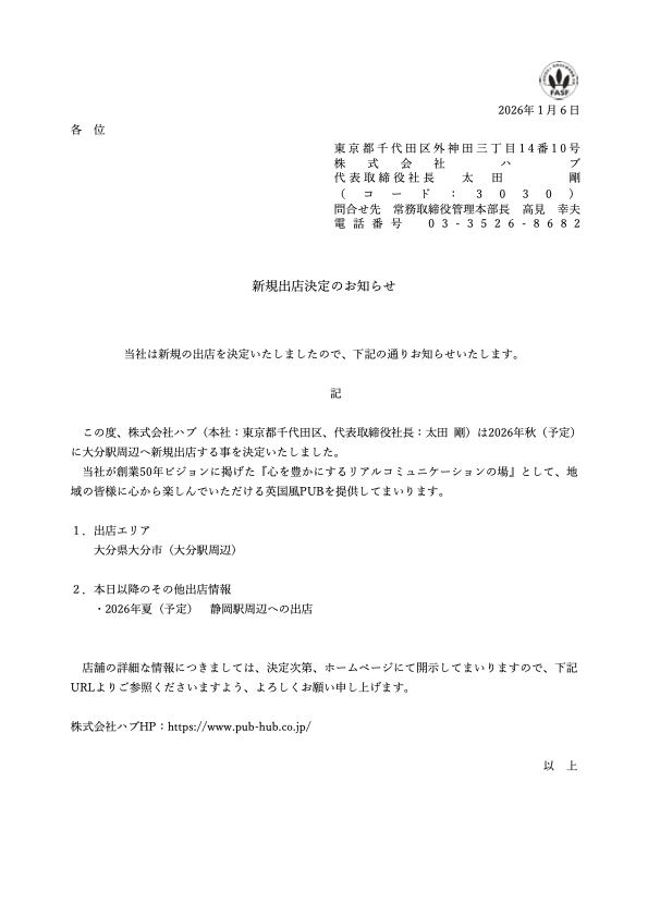 『英国風パブ HUB』などを運営する株式会社 ハブのお知らせによると、2026年秋(予定)に大分駅周辺へ新規出店する事を決定したとのこと。