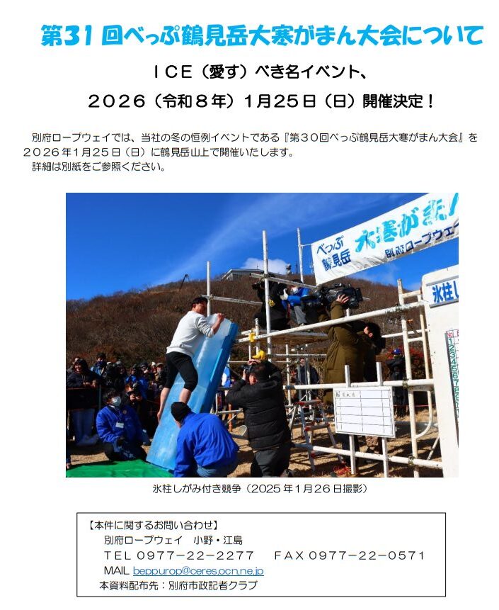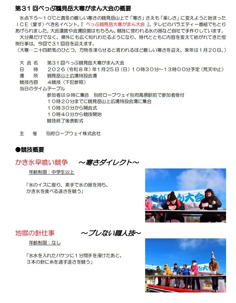 「寒さも楽しさ」に変える ICE (愛す)べき名イベント『第31回 べっぷ鶴見岳大寒がまん大会』が今年も開催されます。