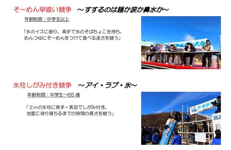 かき氷早食い・地獄の針仕事・そーめん早食い・氷柱しがみ付き競争の4競技が行われ、当日はかき氷の試食(200人限定)や氷のイス体験コーナーもあり、応援・観覧の方も楽しめる内容になっています。