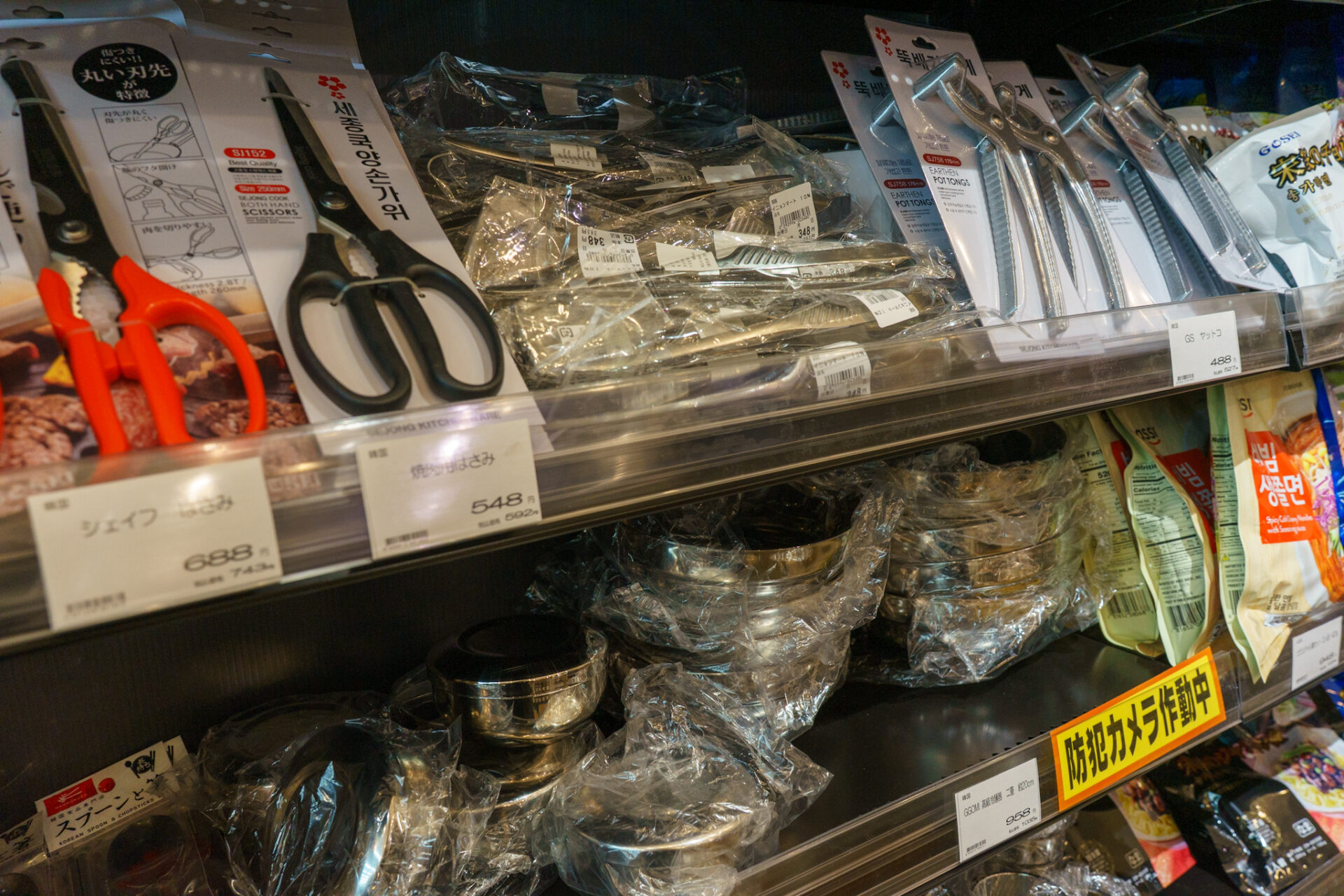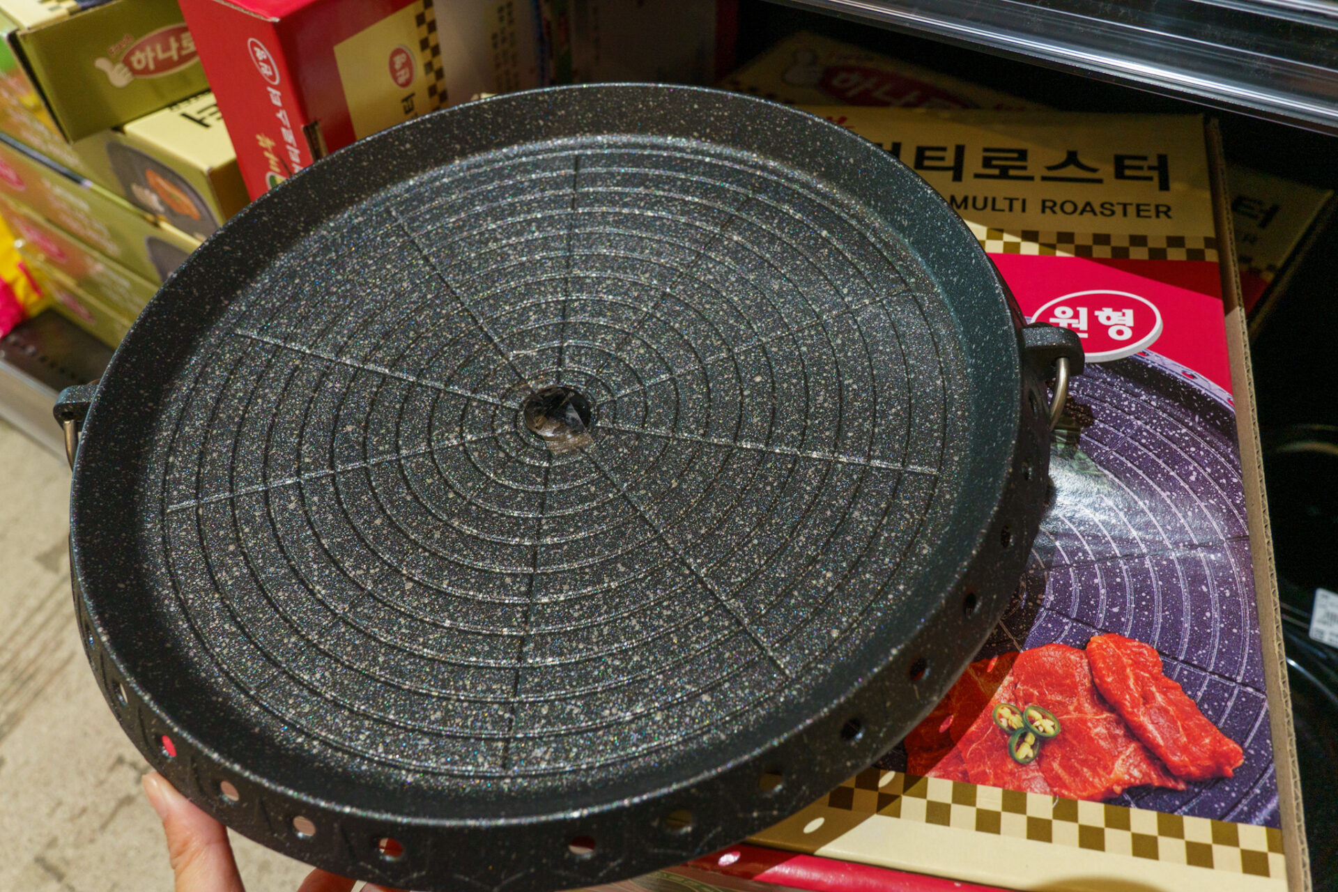 ビビンバ鍋や、「ヤットコ」と呼ばれるビビンバ鍋を持ち上げる時に使う用具、サムギョプサルの鉄板などが販売されていました。