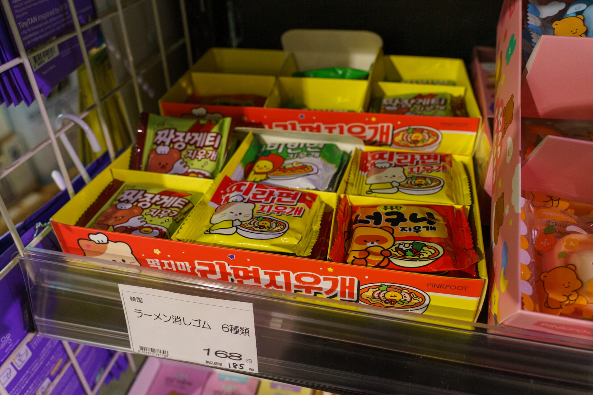 袋ラーメンが小さな消しゴムになった商品や、可愛らしいキャラクターグッズなど、こちらも種類豊富です。