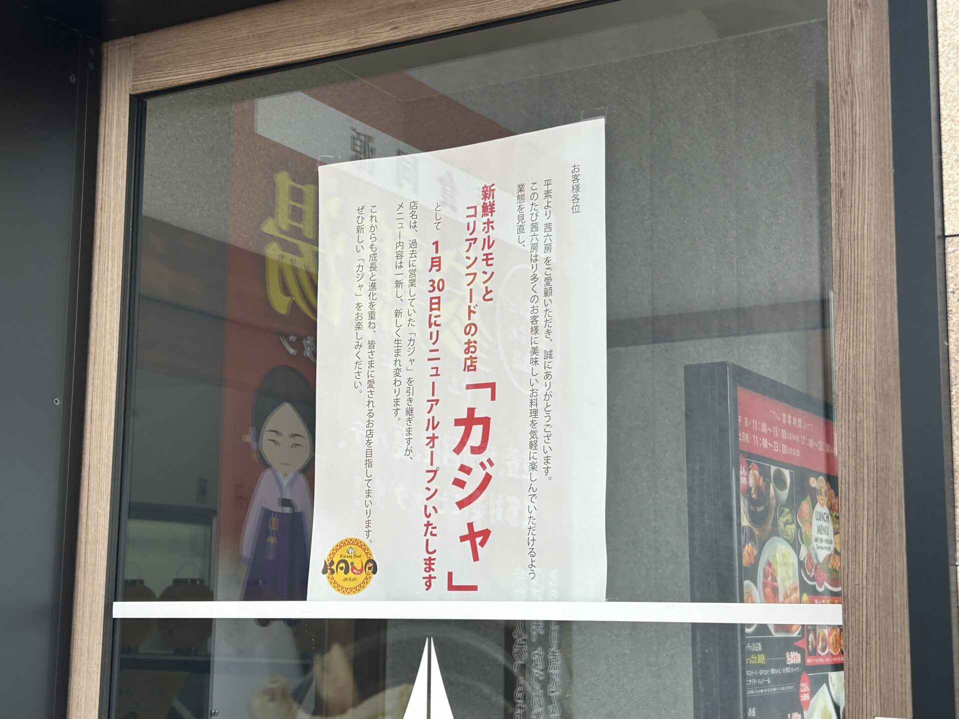 『茜六房』は亜李蘭グループが運営する冷麺が中心の店舗でしたが、2026年1月30日に『コリアンフード カジャ』としてリニューアルしました。