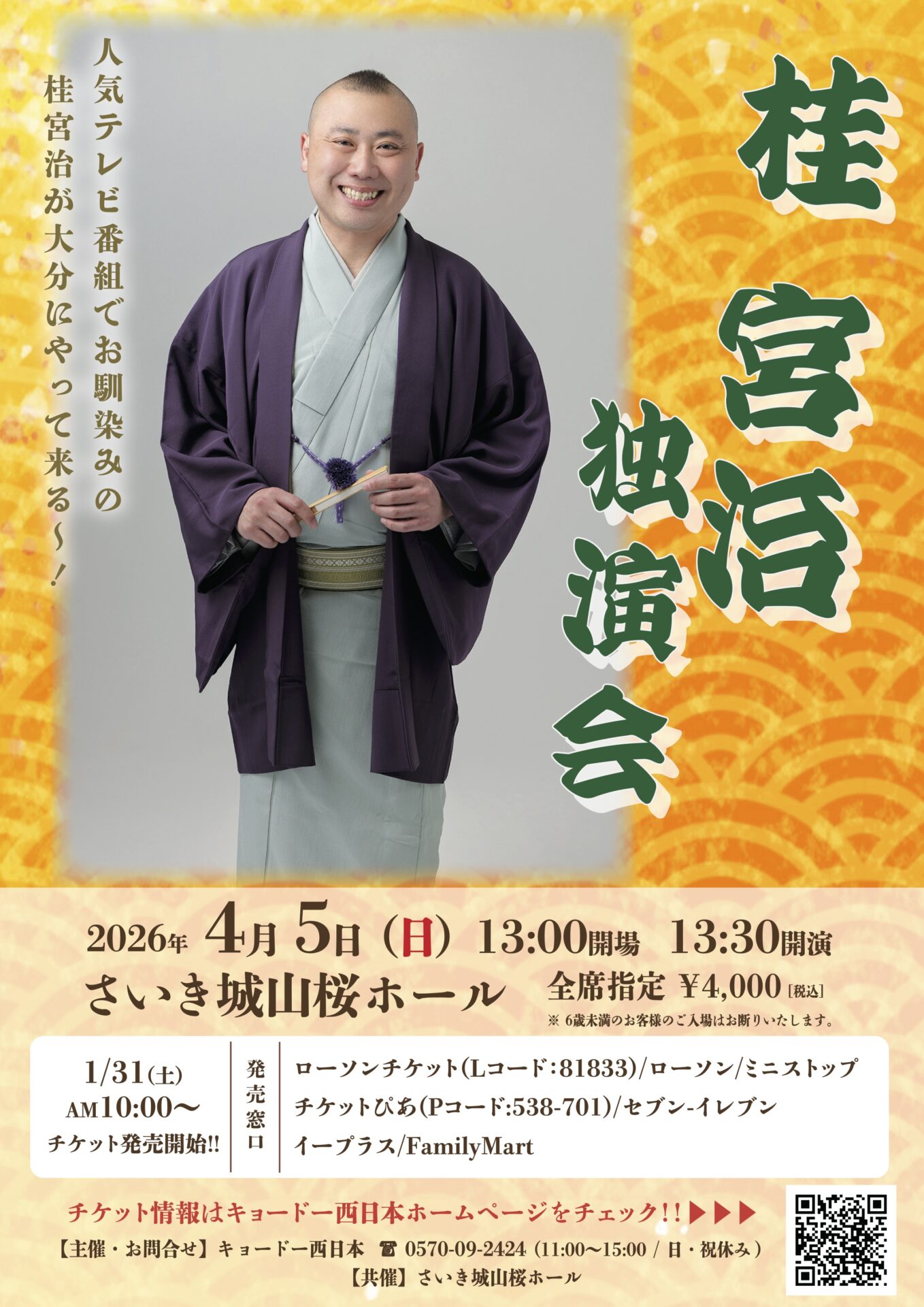 2026年4月5日(日)、佐伯市のさいき城山桜ホールにて桂宮治 独演会が開催されます。