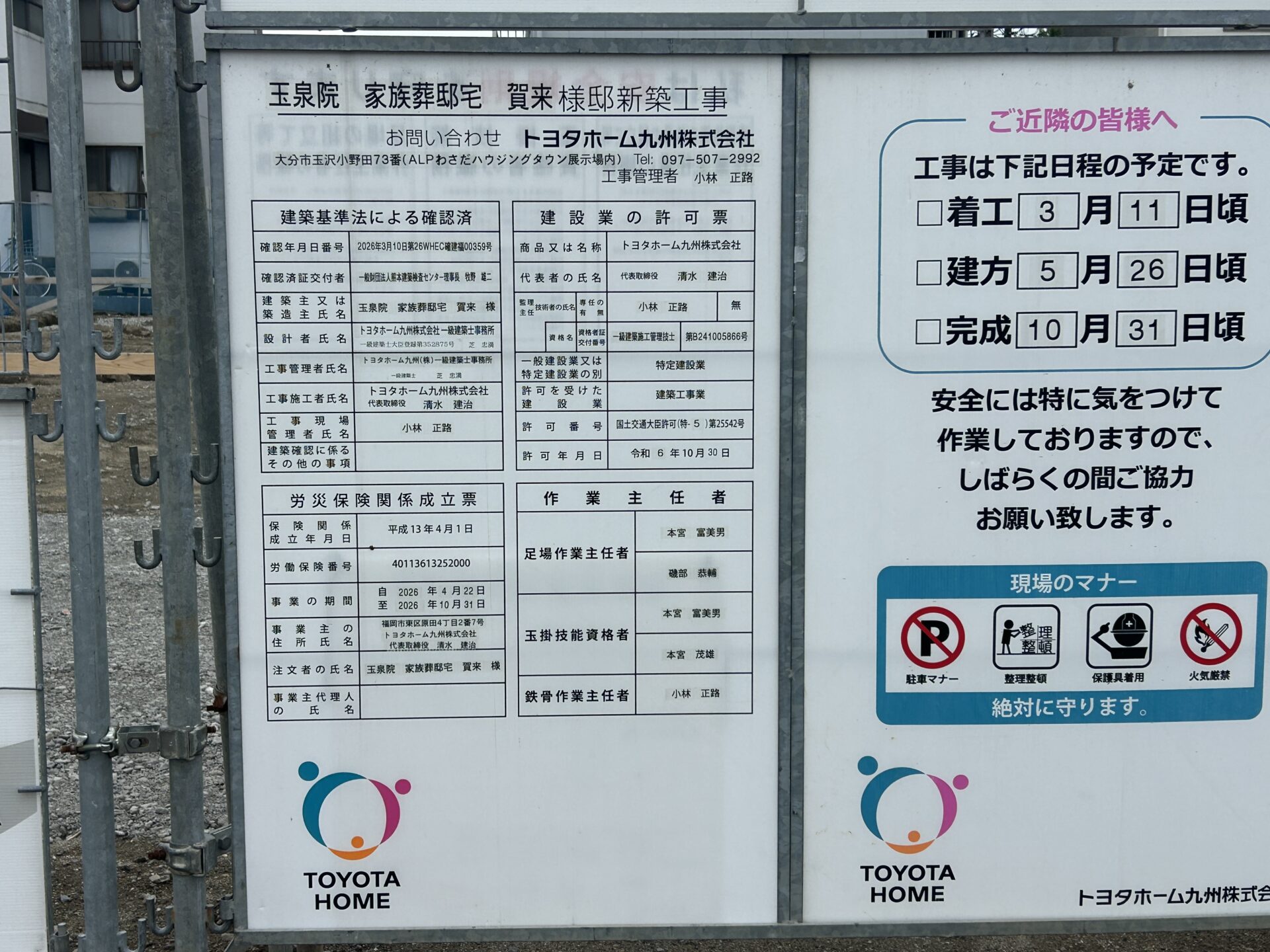 建設現場の看板には、【玉泉院 家族葬邸宅 賀来】と記載がありました。