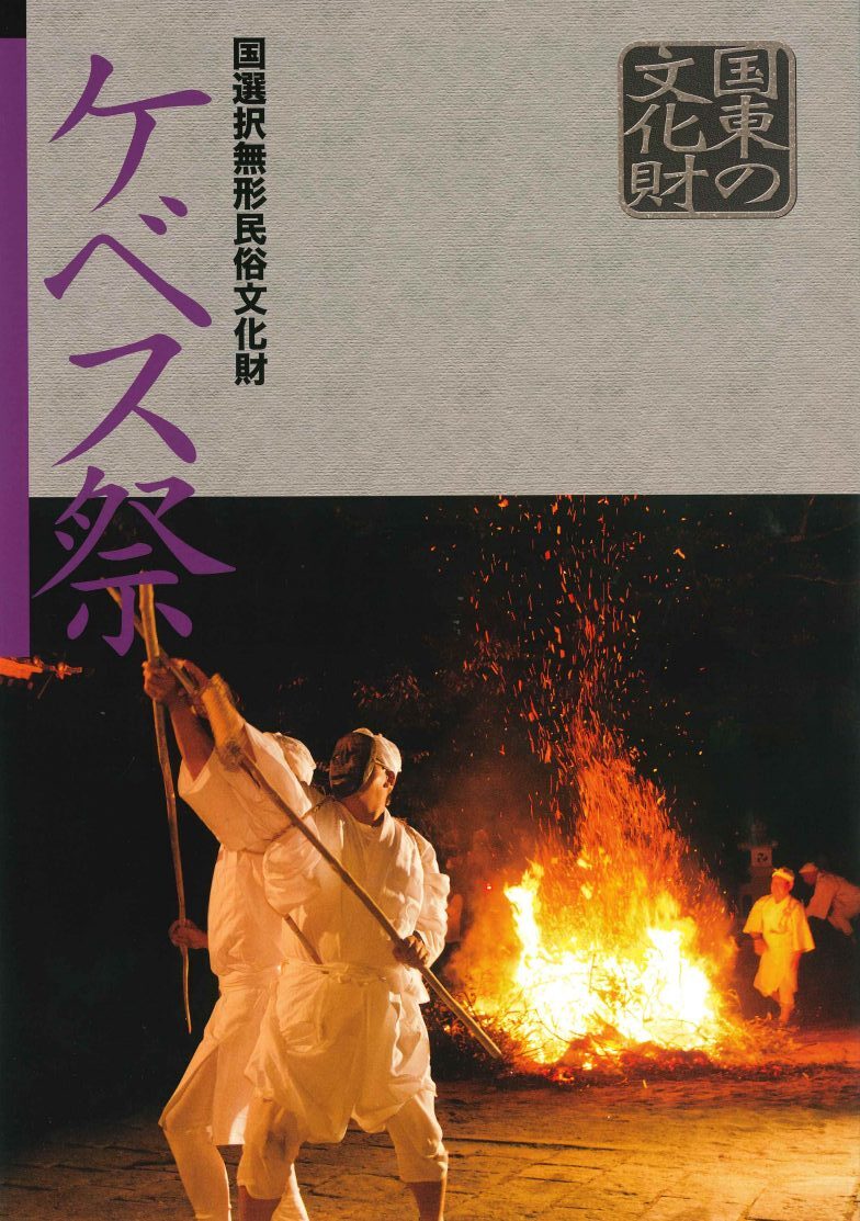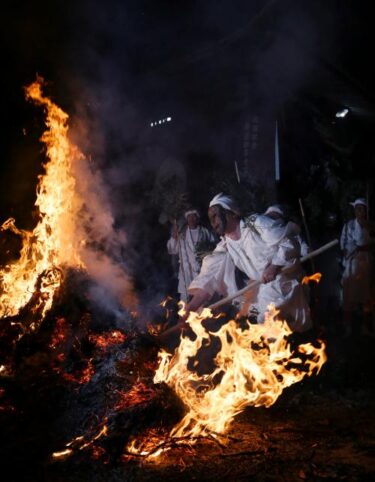 夕闇に包まれた境内に、禊ぎをした「トウバ」が白装束に身を固めて集まります。奇怪な「ケベス」も混えて境内を行列し、やがて境内の一隅に積まれた シダ に火が付けられます。