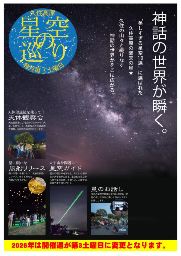 予約不要『~久住高原星空の巡り~2026年は毎月第3土曜日』に開催。次回は1/17(土)!