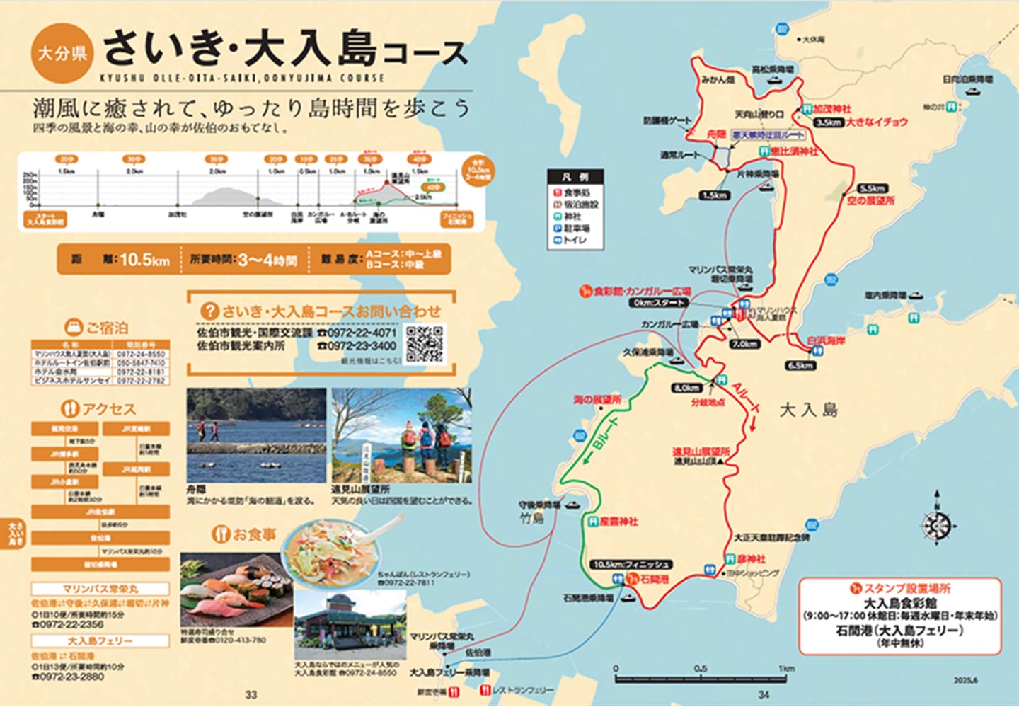 今回の「さいき・大入島コース」は、波音を聞きながら歩く海岸沿いや、四国や豊後水道のほか、佐伯市街地を一望できる360度パノラマの遠見山展望所、島の今昔を肌で感じられる集落道など、島ならではの特徴を活かしたコースです。