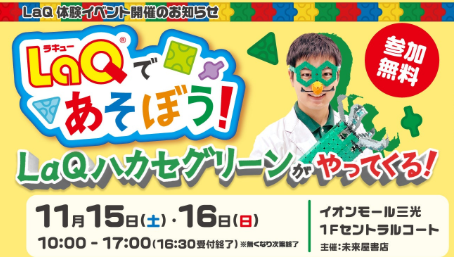 イオンモール三光で『★LaQ体験イベント★LaQ(ラキュー)であそぼう!』が開催されます。