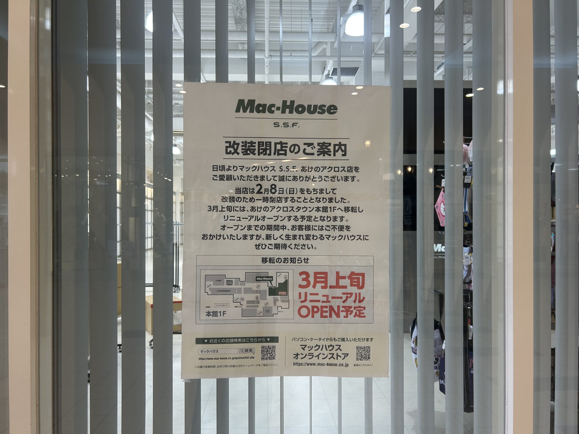 『Mac-House あけのアクロス店』が新館から本館へ移転とのことで、かなり大きな店舗が空くことになります。