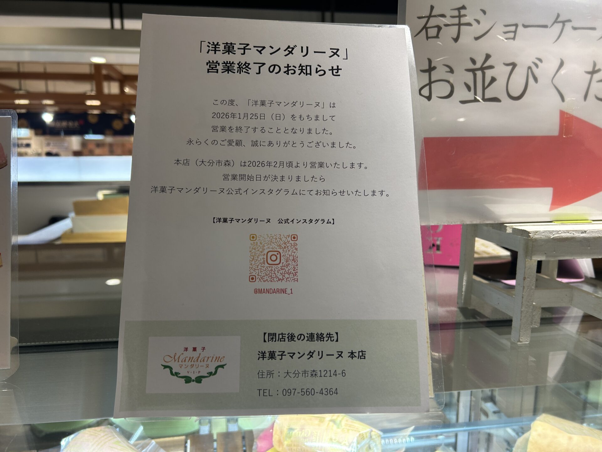 アミュプラザおおいた1階 豊後にわさき市場にある洋菓子店『マンダリーヌ アミュプラザおおいた豊後にわさき市場店』が閉店するそうです。