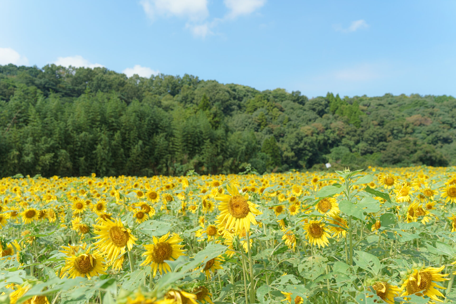 残念ながら花自体はみごろ終盤で花びらが落ちているものも多かったのですが、全体を見るとまだまだ美しいひまわり畑です。