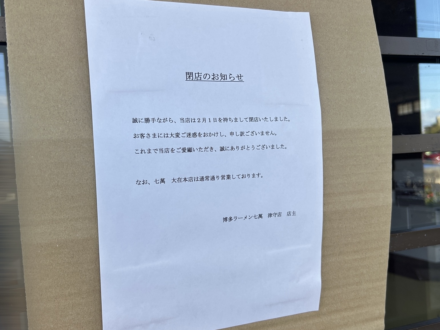 大分市津守の『博多ラーメン七萬 津守店』が閉店していました。