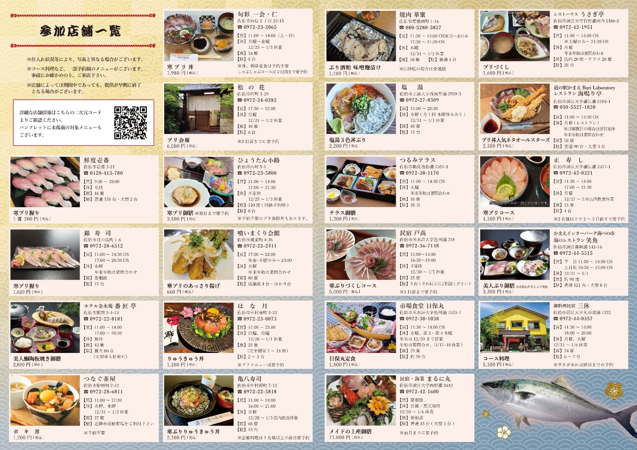 市内の飲食店や宿泊施設と連携し、佐伯産寒ブリを使った特別メニューを期間限定で提供。佐伯の冬の味覚をきっかけに、地域の魅力を再発見できる催しです。