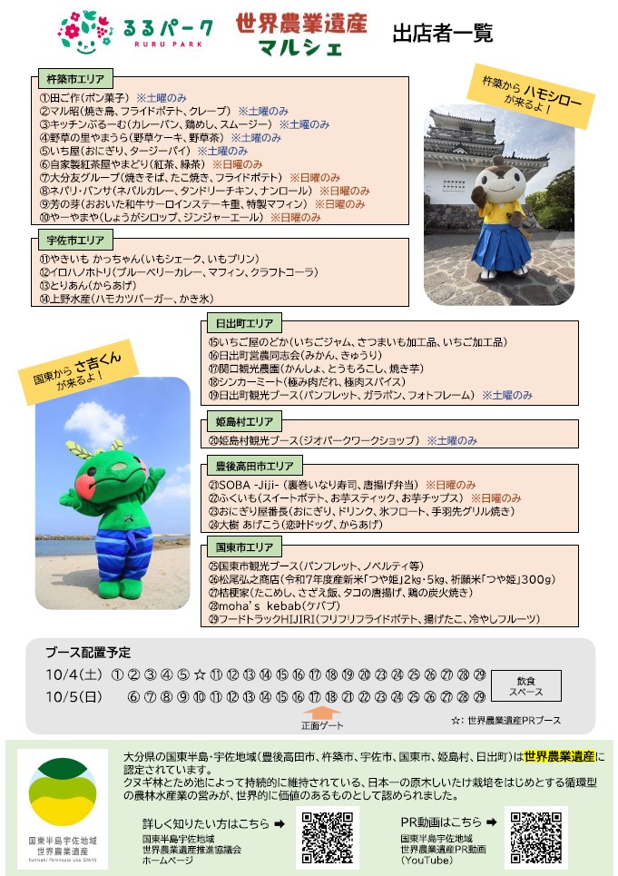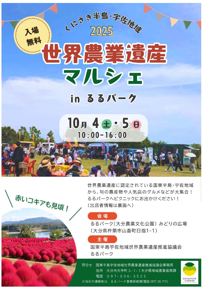 世界農業遺産に認定されている国東半島・宇佐地域から、旬の農産物や人気店のグルメなどが大集合!赤いコキアも見頃です!ぜひ、るるパークにピクニックへ出かけませんか?