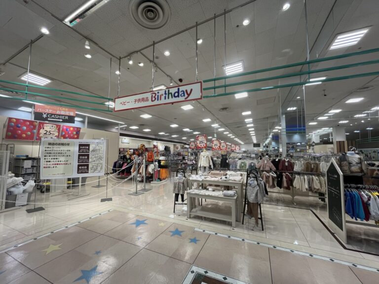 『バースデイ』はあけのアクロスタウンの4階にあります。しまむらグループが展開するベビー・子ども用品専門店です。