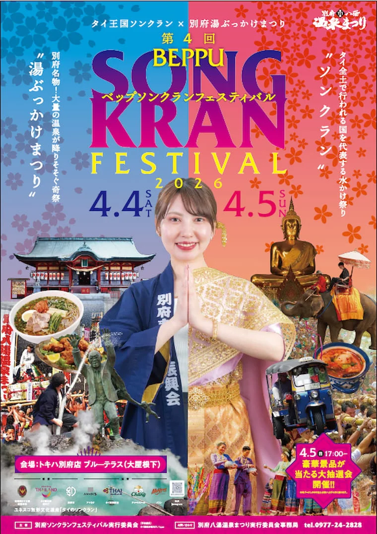 水かけ祭りで知られるタイを代表するお祭り『ソンクラーン』と、大量の温泉が降りそそぐ別府の奇祭『湯ぶっかけまつり』がコラボしたイベントです。4月5日には湯ぶっかけまつりが行われ、213トンものお湯をかけあいます。
