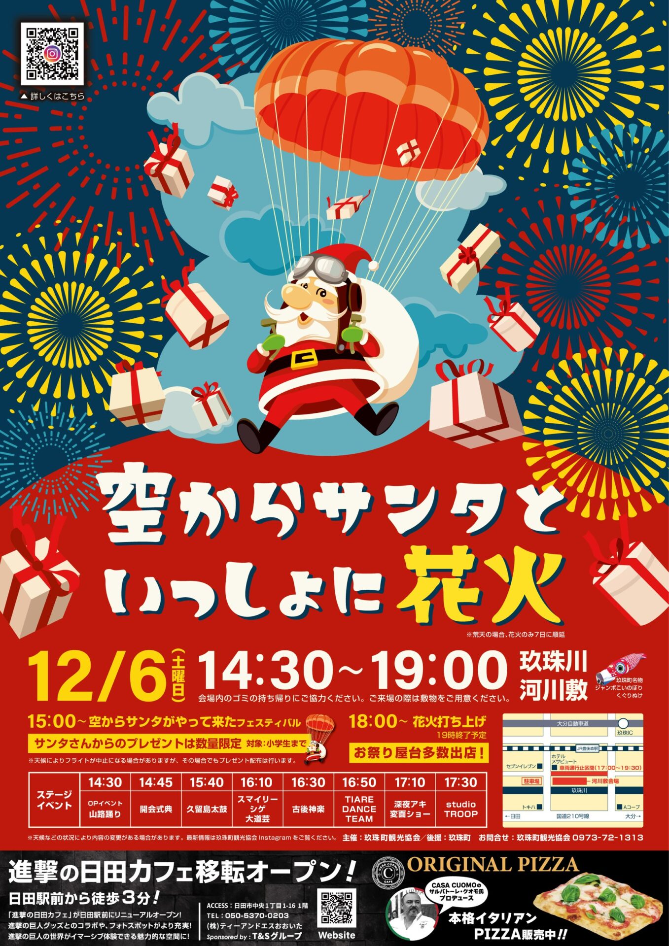今回は初めて 花火の打ち上げが同時開催されます。昼間はステージや屋台を楽しみ、夕方にはサンタからのプレゼントを受け取り、そして夜はサンタとともに夜空を見上げる、特別な一日をお届けします☆