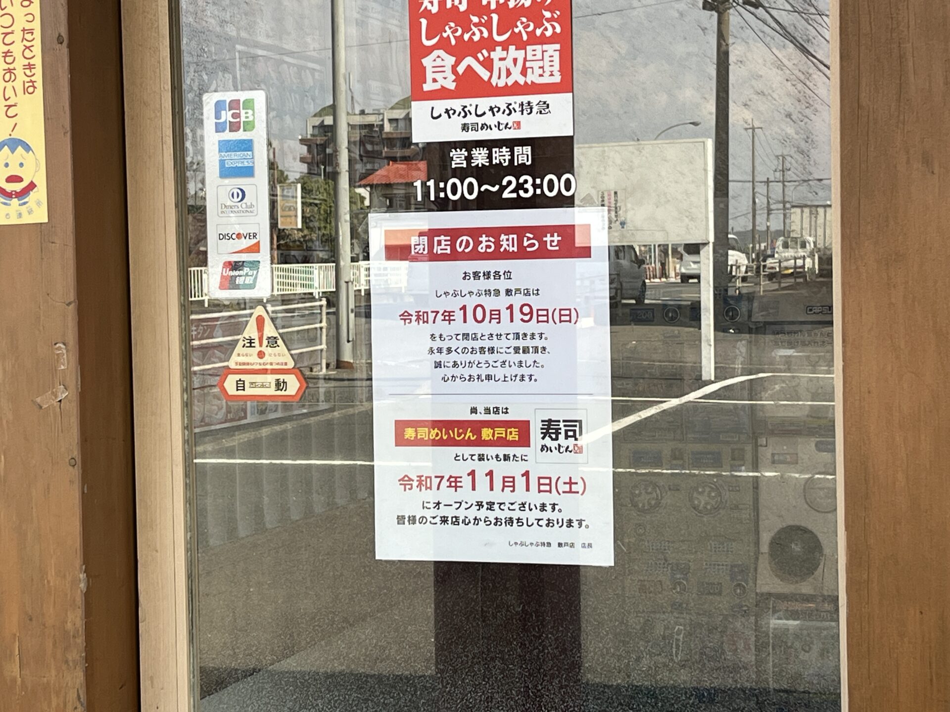 大分市敷戸の「しゃぶしゃぶ特急 敷戸店」が閉店し、『すしめいじん』になるようです。